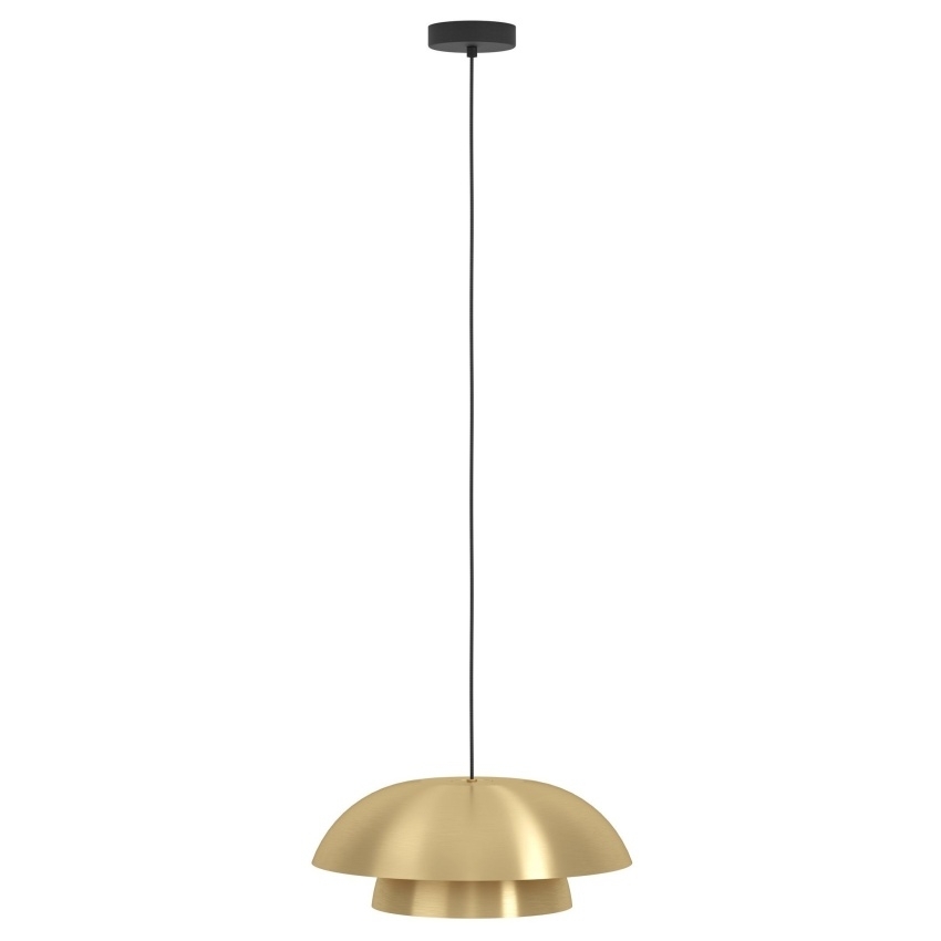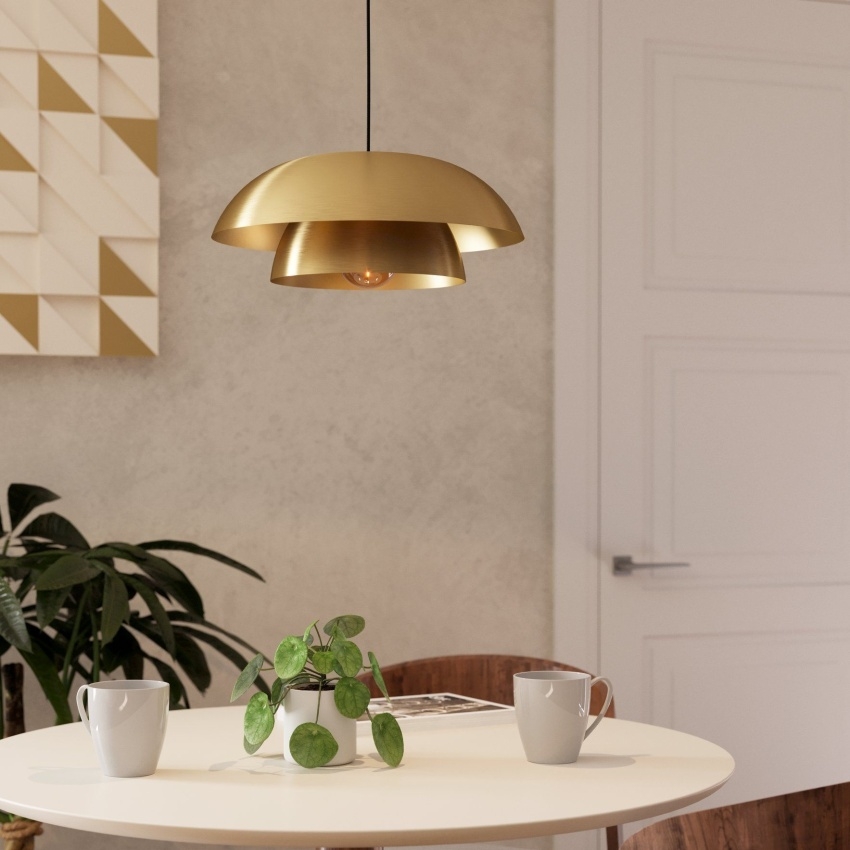 Závěsné svítidlo EGLO CENCIARA přináší do interiéru nádech luxusu a elegance. Tvoří jej dvě vnořená kulatá kovová stínidla z broušené mosazi s vnitřní zlatou povrchovou úpravou, která zajišťuje příjemné nepřímé osvětlení. Díky otvoru na vnitřním stínidle je světlo rozptýlené a vytváří útulnou atmosféru. V kombinaci s černým kovovým vrchlíkem působí svítidlo stylově a stává se výrazným designovým prvkem. Skvěle se hodí nad jídelní stůl, do obývacího pokoje nebo dalších moderních prostor. Žárovka s paticí E27 není součástí balení.