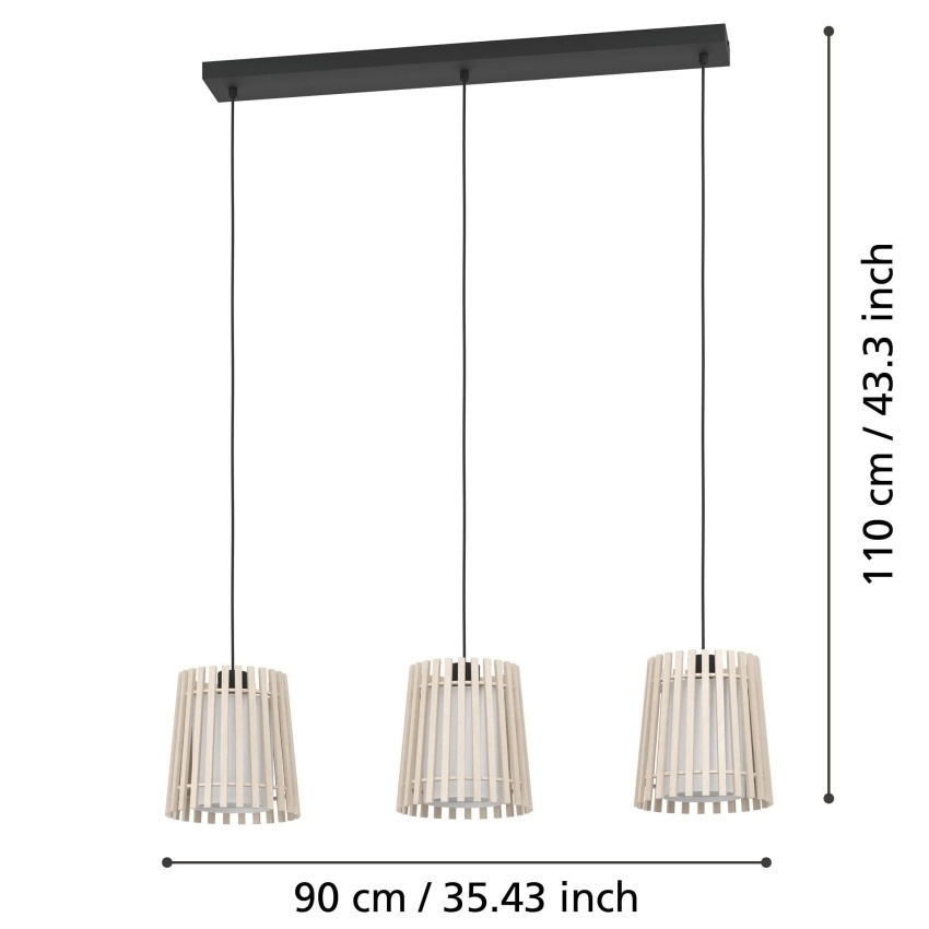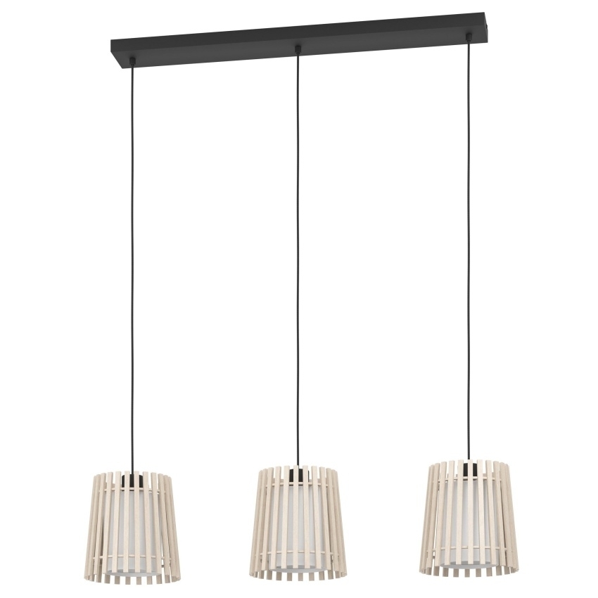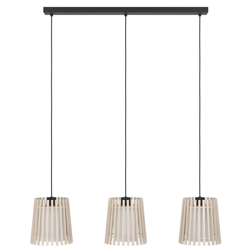 Závěsné svítidlo EGLO FATTORIA 900903 přináší do interiéru přírodní vzhled a útulnou atmosféru. Skládá se ze tří stínidel, z nichž každé je tvořeno dvěma vnořenými částmi – vnější část je vyrobena ze světlého pravého dřeva a vnitřní z bílého textilu. Stínidla jsou zavěšena na třech černých textilních kabelech, které jsou upevněny k podlouhlému kovovému přístřešku ve stejné barvě. Po rozsvícení vytváří svítidlo působivé hry světla a stínu, které oživí jídelnu nebo obývací prostor. Žárovky nejsou součástí balení, použít lze jakékoliv s paticí E27. Pro rovnoměrné osvětlení se doporučují žárovky z opálového skla.
