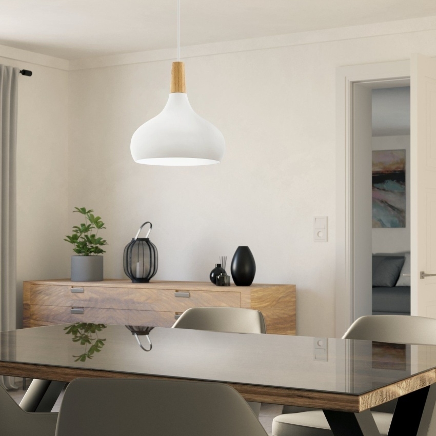 Závěsné svítidlo EGLO Sabinar 901178 je elegantním spojením moderního designu a přírodních materiálů. Bílé kovové tělo doplňuje hnědé dřevěné stínidlo z kaučukovníku s FSC certifikací, které vytváří příjemnou atmosféru a útulné osvětlení. Díky průměru 280 mm a výšce 1100 mm je svítidlo ideální nad jídelní stůl, do obývacího pokoje nebo ložnice. Patice E27 umožňuje použití různých typů žárovek až do výkonu 40 W. Určeno pro interiérové použití s krytím IP20.