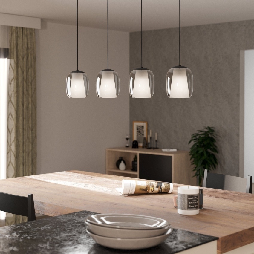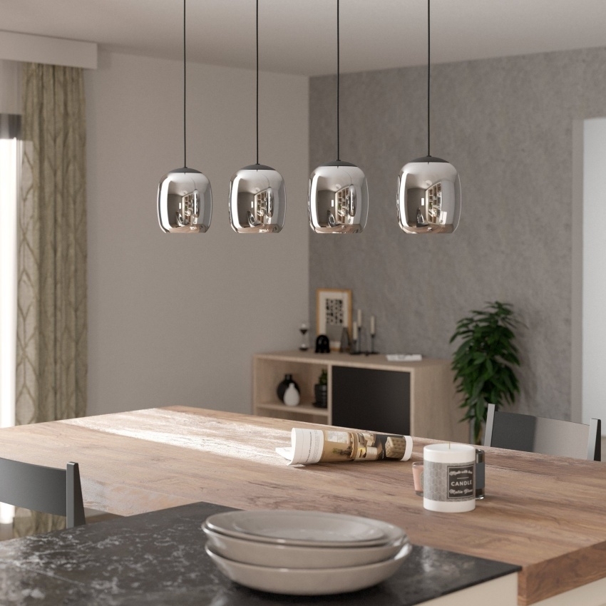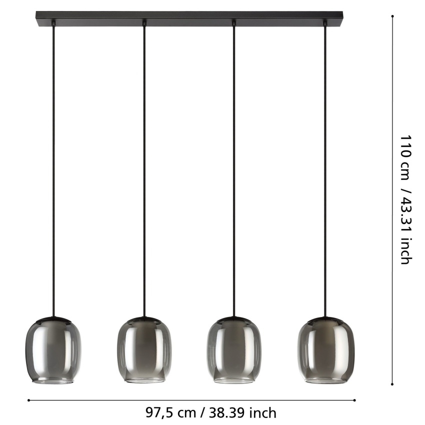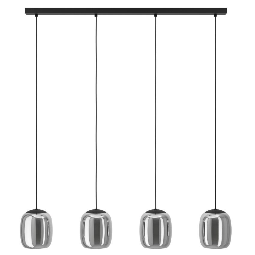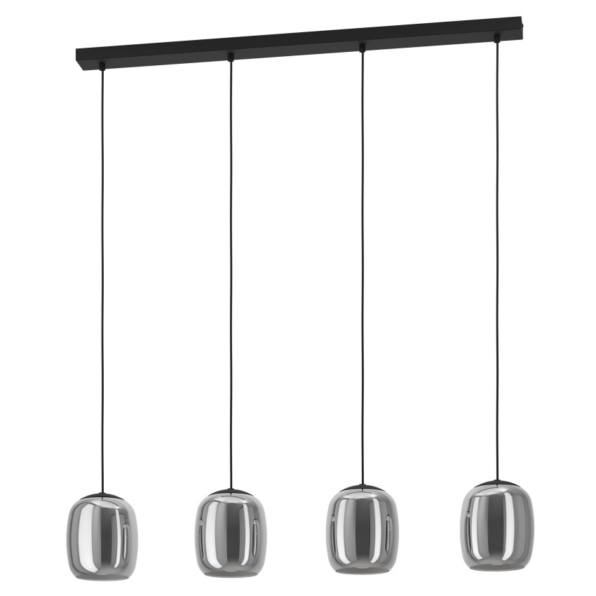 Stylové závěsné svítidlo EGLO Ciampino 901193 zaujme kombinací černého kovového těla a šedých bublinkových skleněných stínidel. Moderní design dodává interiéru originální vzhled, zatímco čtyři patice E27 poskytují možnost osazení různými světelnými zdroji až do výkonu 28 W, což zaručuje dostatek světla i pro větší prostory. Rozměry 975 × 150 × 1100 mm předurčují toto svítidlo k umístění nad jídelní stůl, do obývacího pokoje nebo jiných reprezentativních prostor. Určeno pro interiérové použití s krytím IP20.