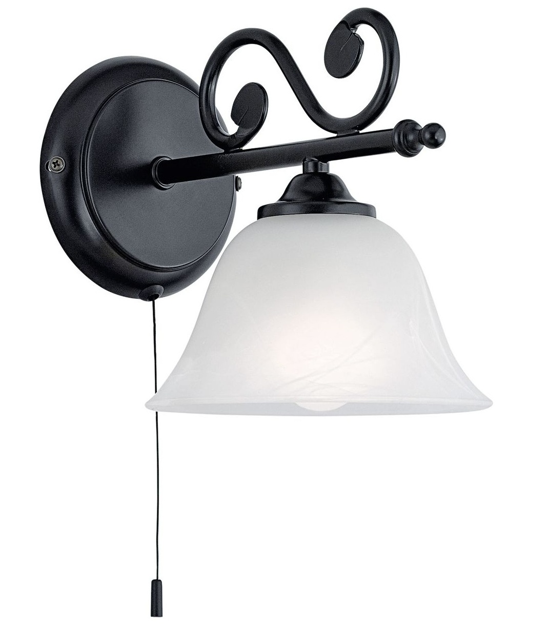 Nástěnné svítidlo MURCIA má černé kovové tělo a kulaté stínidlo z bílého alabastrového skla. Krásná kombinace skleněného stínidla a složitých černých kovových prvků dodává světlu klasický vzhled. Světlo se zapíná a vypíná pomocí tahového vypínače. Design se skvěle hodí do interiérů ve stylu chaty a poskytuje útulné osvětlení jakéhokoli prostoru, ať už v obývacím pokoji, ložnici, chodbě nebo jídelně. Žárovka není součástí dodávky. Výrobek má objímku žárovky E14 a vyžaduje žárovku E14.