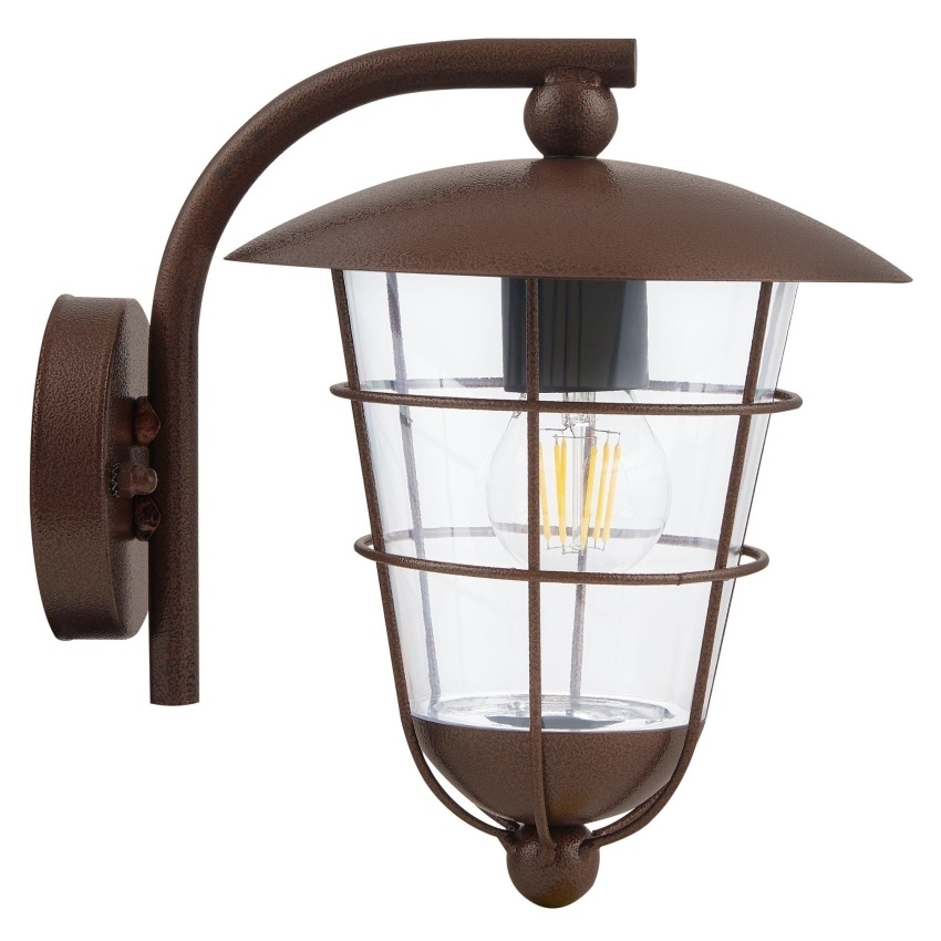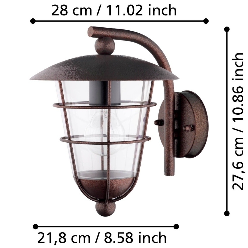 Venkovní nástěnné svítidlo EGLO PULFERO 1 94855 je elegantní lampa ve stylu lucerny, která dodá vašemu exteriéru klasický a útulný vzhled. Je vyrobeno z odolného pozinkovaného kovu v antické hnědé barvě a doplněno čirými plastovými panely, které umožňují rovnoměrné rozptýlení světla. Díky stupni krytí IP44 je chráněno proti stříkající vodě, a proto je vhodné pro bezpečné venkovní použití. Lampa je kompatibilní s libovolnou žárovkou s paticí E27 a umožňuje použití zdroje do výkonu 60W. Skvěle se hodí pro osvětlení vstupů, zahradních cest nebo teras.