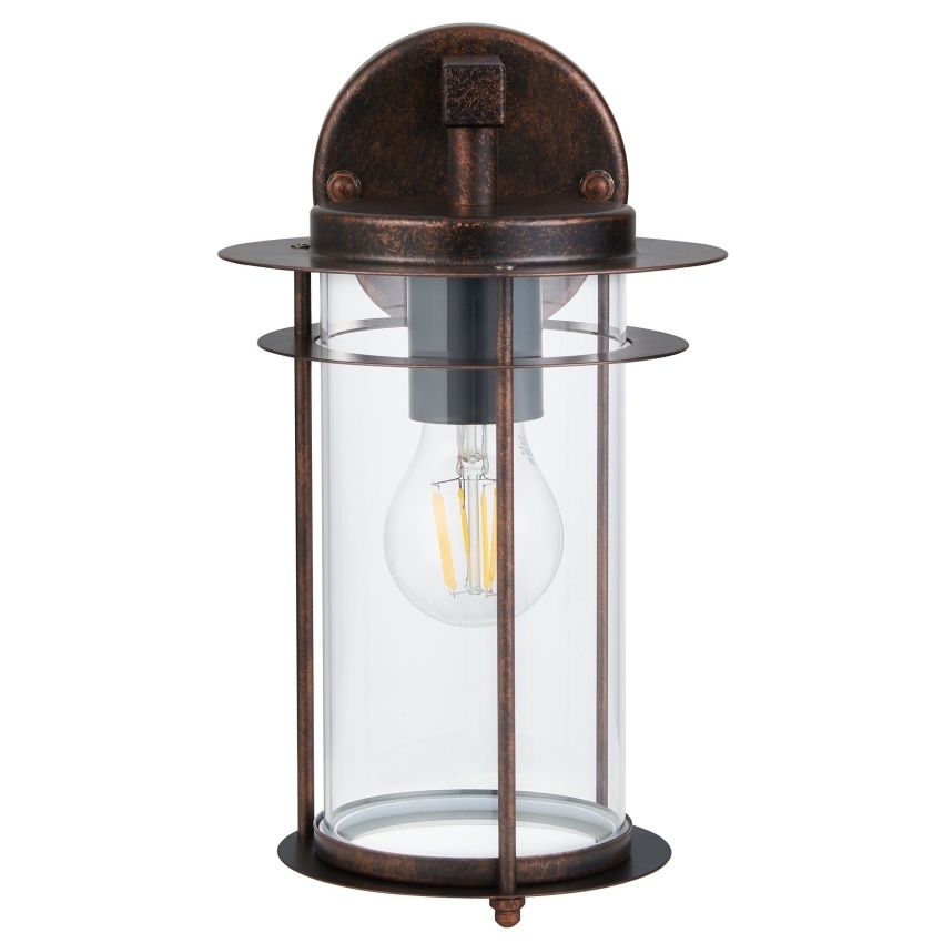 Venkovní nástěnné svítidlo EGLO VALDEO 96241 v antické měděné barvě s čirým skleněným válcem a krytím IP44.