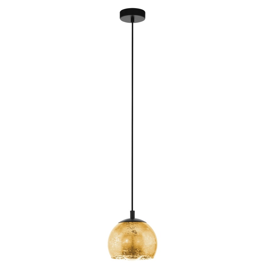 Závěsné svítidlo ALBARACCIN má kulové skleněné stínidlo s povrchovou úpravou ve stylu zlatého listu. Stínidlo je zavěšeno na kulatém černém kovovém vrchlíku na černém textilním kabelu. Elegantní závěsné svítidlo se vyznačuje jednoduchým designem a s průměrem 19 cm se hodí do moderních interiérů a poskytne stylové osvětlení v obývacím pokoji nebo jídelně nad stolem. Žárovky nejsou součástí dodávky. Výrobek má objímku žárovky E27 a vyžaduje 1 žárovku E27.
