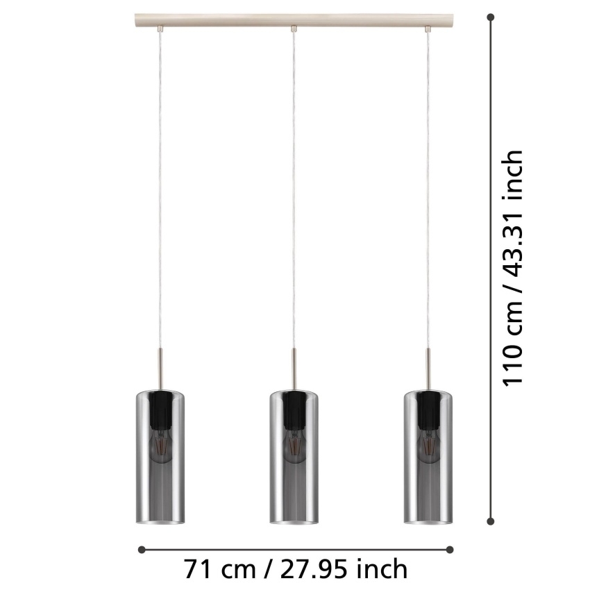 Závěsné svítidlo EGLO SELVINO 98695 kombinuje moderní design a elegantní kouřové skleněné stínidla, která po rozsvícení vytvářejí působivý světelný efekt. Konstrukce z matného niklu podtrhuje luxusní vzhled a univerzální využití svítidla. Díky délce 710 mm a třem závěsům je ideální volbou nad jídelní nebo barový stůl, ale hodí se také do obývacího pokoje, ložnice, vstupní haly či pracovny. Svítidlo je určeno pro tři žárovky s paticí E27 do výkonu 15W (nejsou součástí balení).