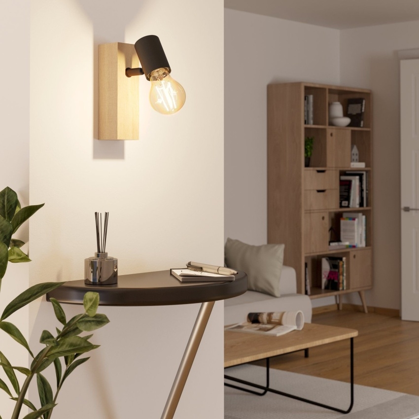 Nástěnné bodové svítidlo EGLO TOWNSHEND 3 99477 v industriálním stylu z kombinace černého kovu a hnědého dřeva.