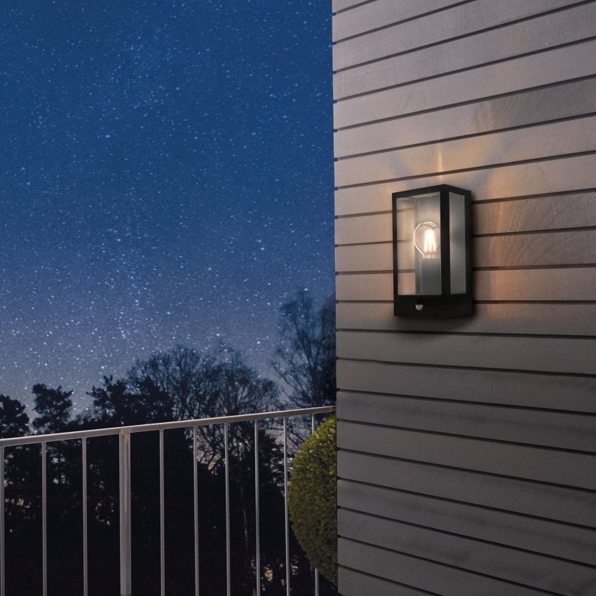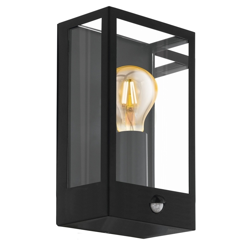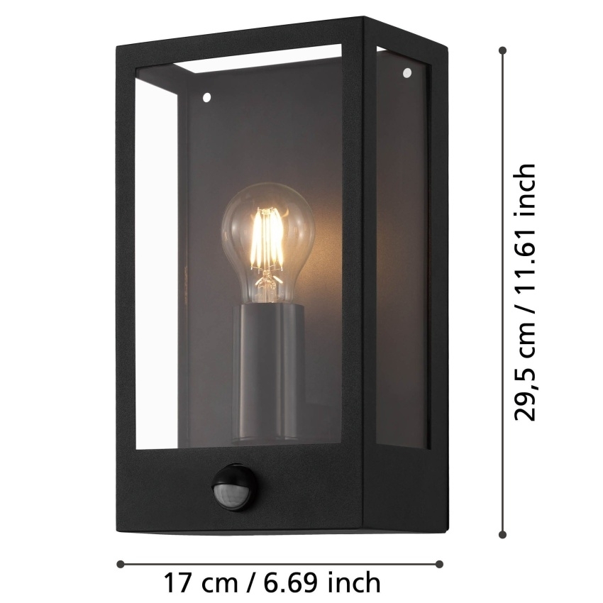 Venkovní nástěnné svítidlo EGLO ALAMONTE 99587 s černým kovovým rámem, čirým sklem a integrovaným pohybovým a soumrakovým senzorem.