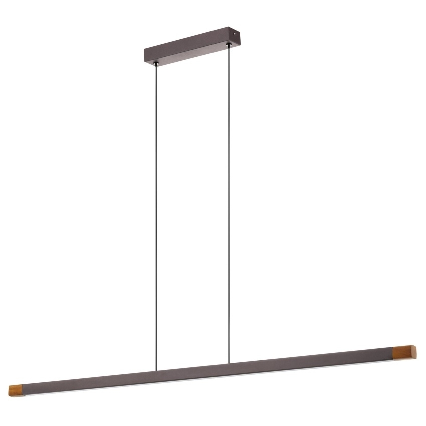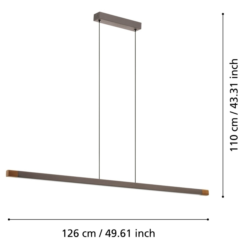 Svítidlo EGLO LISCIANA 900175 je elegantní závěsné LED osvětlení v moderním lineárním designu. Tělo tvoří hliníkový profil v šedé barvě, který je doplněn o koncovky z masivního dřeva gumovníku ve vzhledu ořechu. Černé textilní kabely a kovová stříška podtrhují jeho stylový vzhled. Integrovaný LED zdroj o výkonu 22 W poskytuje světelný tok 2500 lm a příjemné teplé bílé světlo o teplotě 3000 K. Svítidlo je stmívatelné pomocí vhodného nástěnného stmívače a díky své délce 126 cm je ideální pro osvětlení jídelního stolu nebo delší pracovní plochy v moderních interiérech.