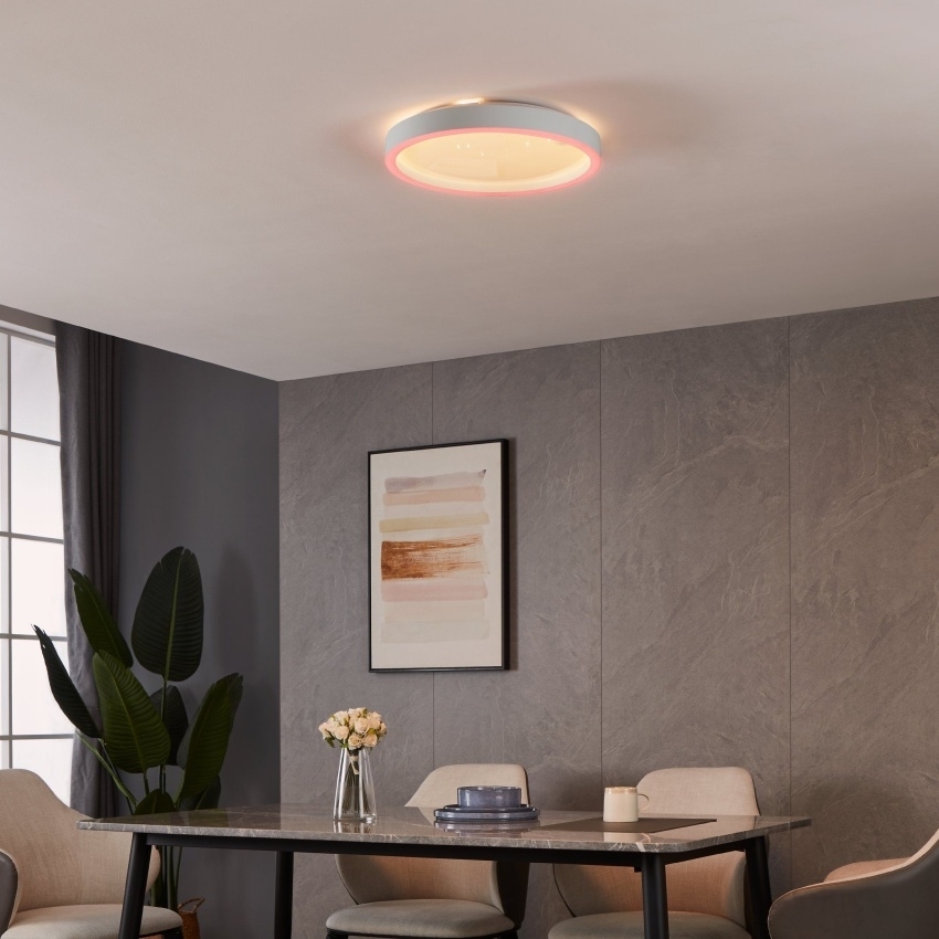 Svítidlo EGLO MONTEMORELOS-Z 900408 je moderní chytré LED stropní osvětlení z řady Connect-Z, které spojuje elegantní design s pokročilými funkcemi. Kulaté tělo o průměru 42 cm je tvořeno bílým rámem a plastovým difuzorem s jemným třpytivým efektem, který připomíná hvězdnou oblohu. Integrovaný LED zdroj o výkonu 17,8 W poskytuje světelný tok 2150 lm a umožňuje nastavení teploty světla v rozsahu 2700–6500 K. Vnější prstenec navíc nabízí RGB dekorativní osvětlení, přičemž hlavní světlo a rám lze zapínat, vypínat a stmívat samostatně. Ovládání je možné prostřednictvím aplikace AwoX Home Control, dálkového ovladače i hlasových asistentů. Svítidlo podporuje Bluetooth a ZigBee 3.0 a díky chytrým funkcím, jako je časovač nebo simulace přítomnosti, se stane praktickým doplňkem každé domácnosti.