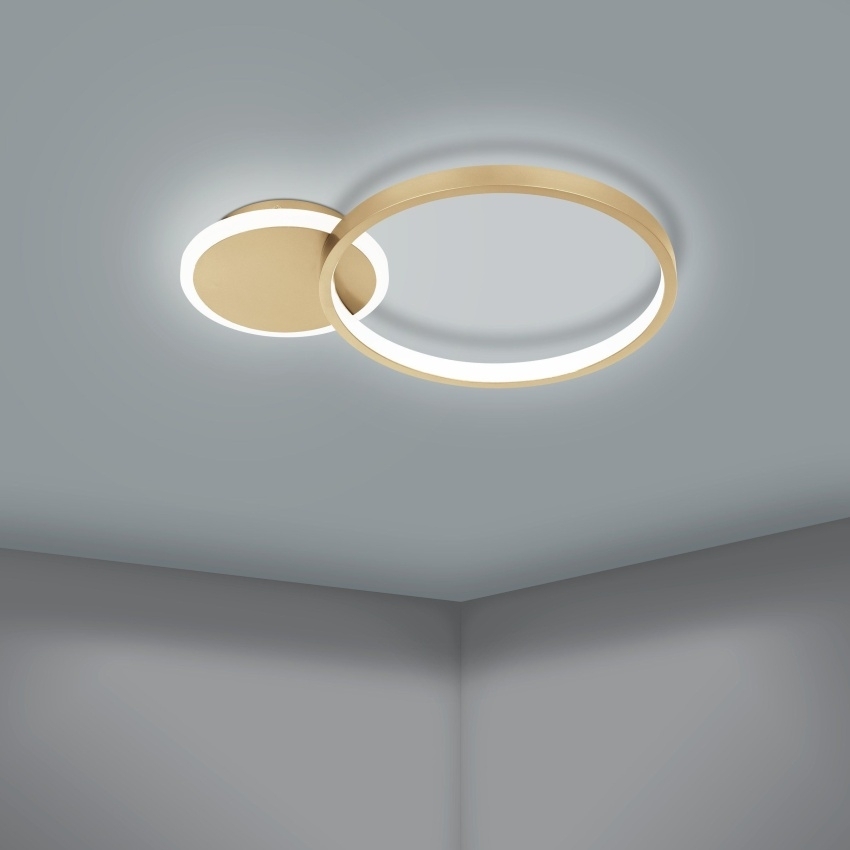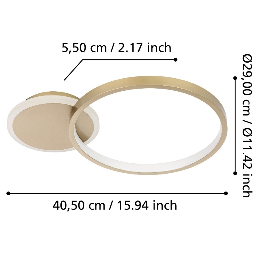 Elegantní stropní LED svítidlo EGLO GAFARES 900423 ve zlatobílé kombinaci s výkonem 15 W, světelným tokem 2100 lm a nastavitelnou teplotou světla 3000–6500 K.
