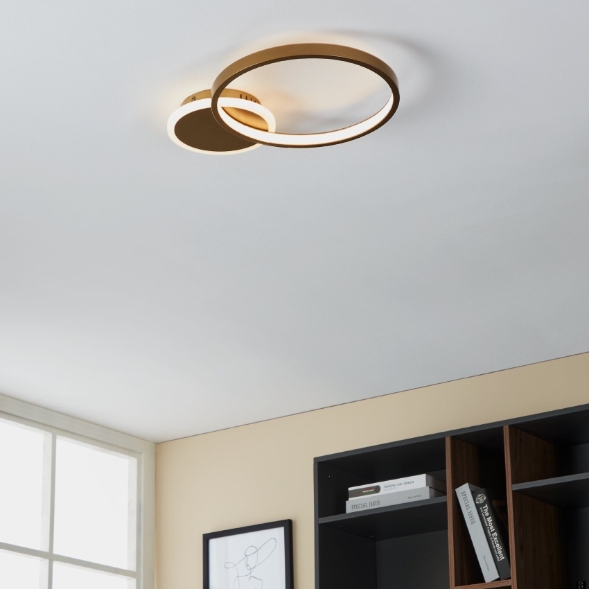Stropní LED svítidlo EGLO GAFARES 900423 přináší moderní design s elegantní zlatou povrchovou úpravou, která dodá interiéru luxusní nádech. Konstrukce je tvořena bílou kulatou základnou a prstencovým LED profilem ve zlaté barvě, doplněným o bílý plastový difuzor. Integrovaný LED zdroj o výkonu 15 W poskytuje světelný tok 2100 lm a umožňuje nastavit teplotu světla od teplé bílé (3000 K) po studenou bílou (6500 K). Ovládání probíhá pohodlně prostřednictvím přiloženého dálkového ovladače, který umožňuje stmívání, aktivaci nočního režimu či nastavení časovače s automatickým vypnutím po 30 minutách. Svítidlo se díky svému minimalistickému vzhledu hodí do obývacího pokoje, ložnice, kuchyně, jídelny i chodby.
