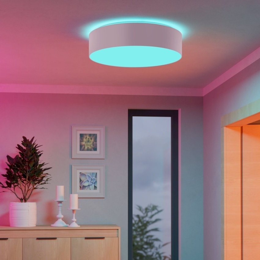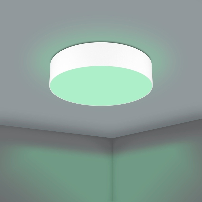 Stropní LED svítidlo EGLO ROMAO-Z 900439 z řady Connect-Z smart home přináší elegantní kombinaci textilního stínidla a moderní technologie. Kulaté svítidlo o průměru 57 cm je vyrobeno z bílé textilie s plastovým difuzorem, který rozptyluje světlo rovnoměrně po celé místnosti. Integrovaný LED zdroj o výkonu 35 W poskytuje světelný tok 3500 lm a umožňuje nastavení teploty světla v rozsahu 2700–6500 K i výběr z široké palety barev RGB. Ovládání probíhá pomocí aplikace AwoX Home Control, dálkového ovladače nebo hlasových asistentů. Svítidlo podporuje Bluetooth a ZigBee 3.0 a nabízí chytré funkce, jako je stmívání, časovač či simulace přítomnosti. Díky svému modernímu designu se stane poutavým doplňkem každé místnosti – od obývacího pokoje až po ložnici či jídelnu.