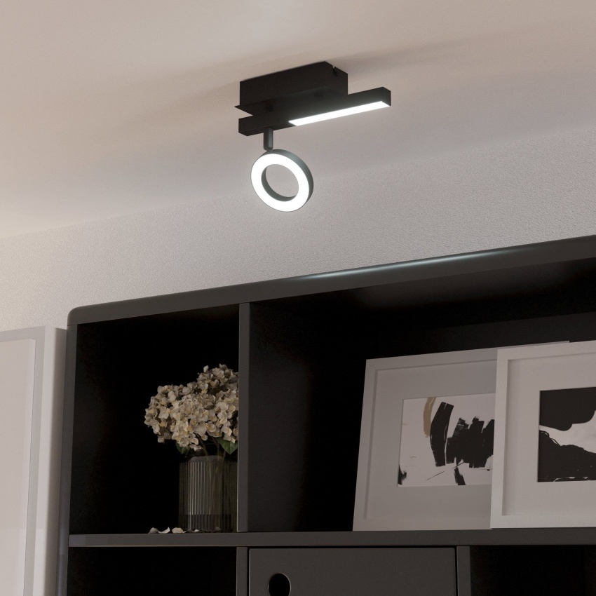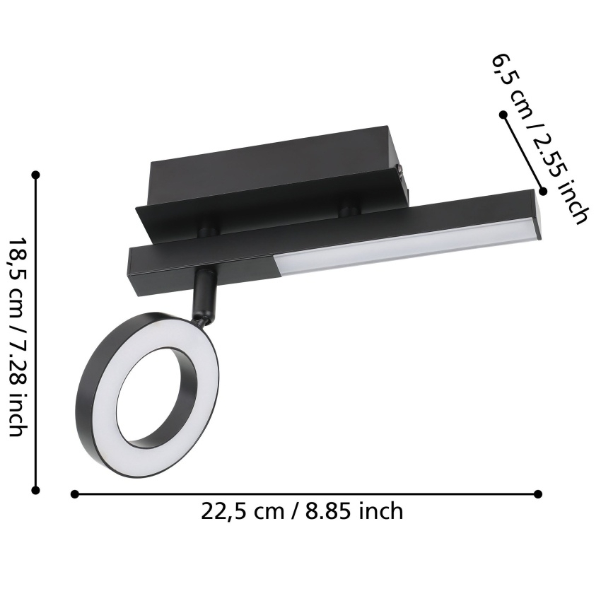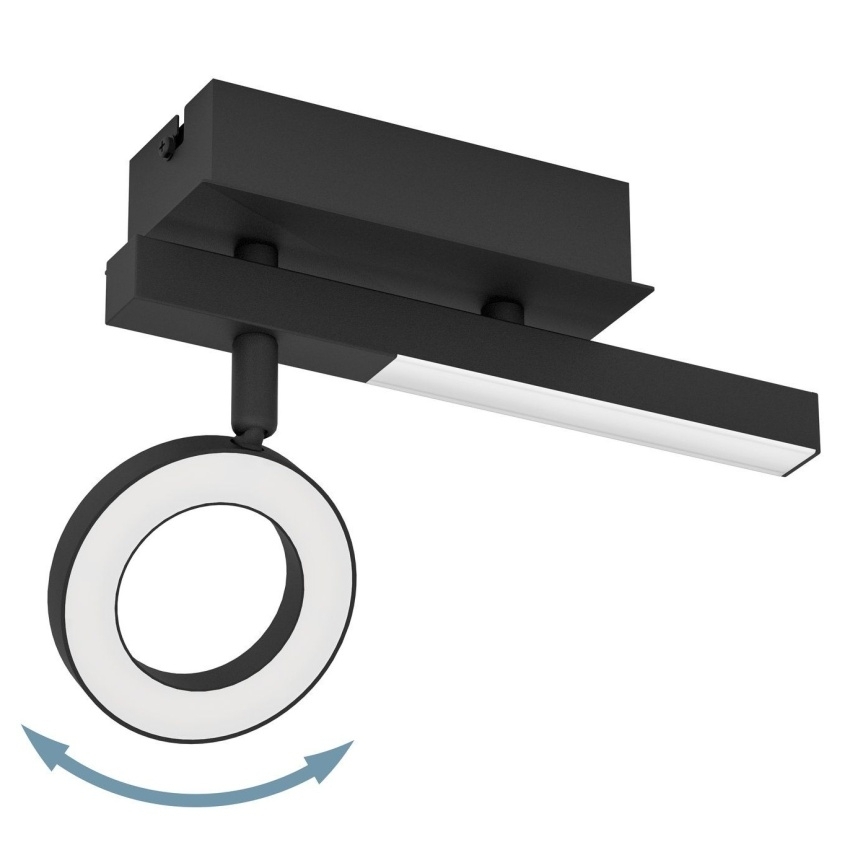 Nástěnné bodové svítidlo EGLO CARDILLIO 2 900513 je elegantním doplňkem moderních interiérů. Je vyrobeno z černého kovu s bodovou hlavou ve tvaru prstence a doplněno o podlouhlou světelnou plochu v přímém rameni. Integrované LED diody poskytují světelný tok 640 lm v příjemné teplé bílé barvě (3000 K). Otočná hlava svítidla umožňuje flexibilně nasměrovat světlo a vytvořit tak individuální světelné akcenty v místnosti. Díky svému minimalistickému designu se hodí do obývacího pokoje, ložnice, kuchyně i předsíně.