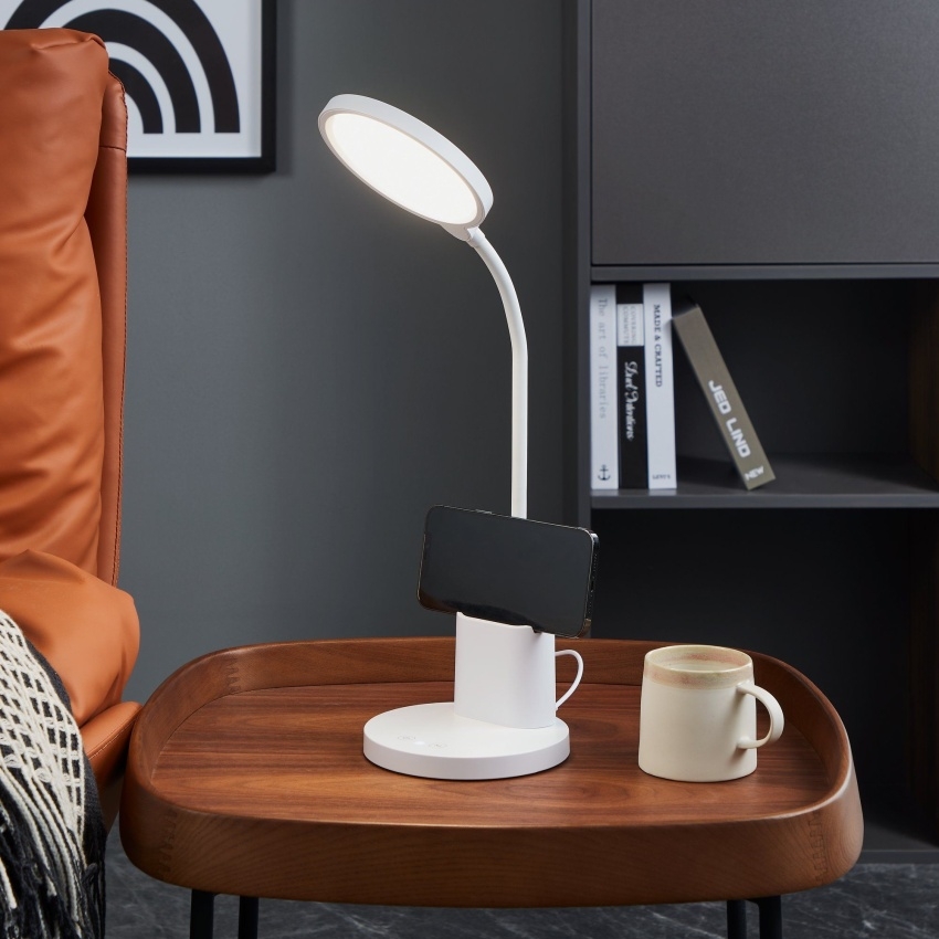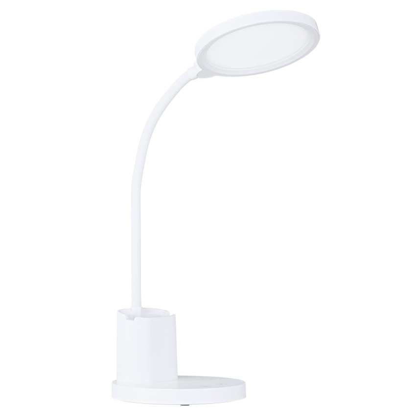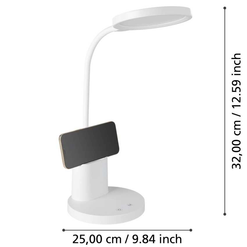 Stolní LED lampička EGLO BROLINI 900529 v bílé barvě, s nastavitelnou intenzitou a teplotou světla, vestavěným akumulátorem a držákem na mobilní telefon.