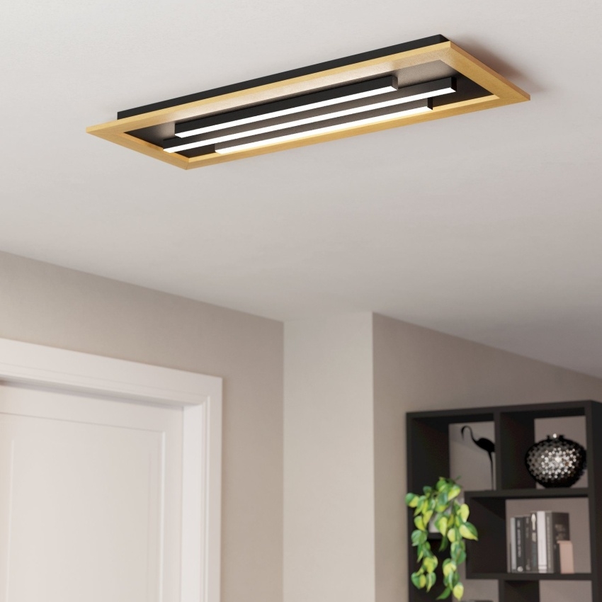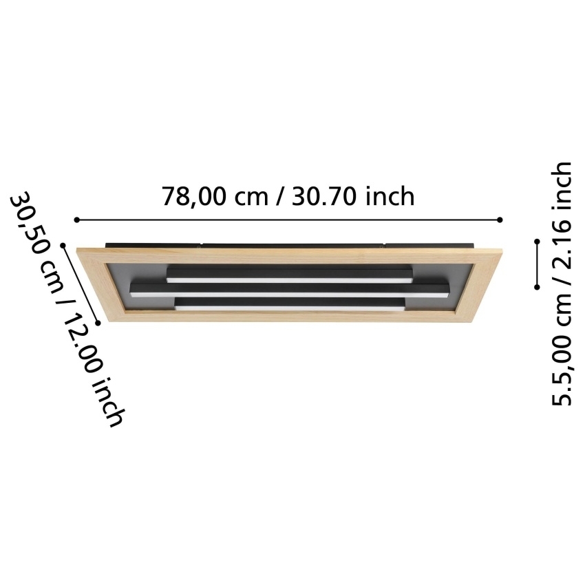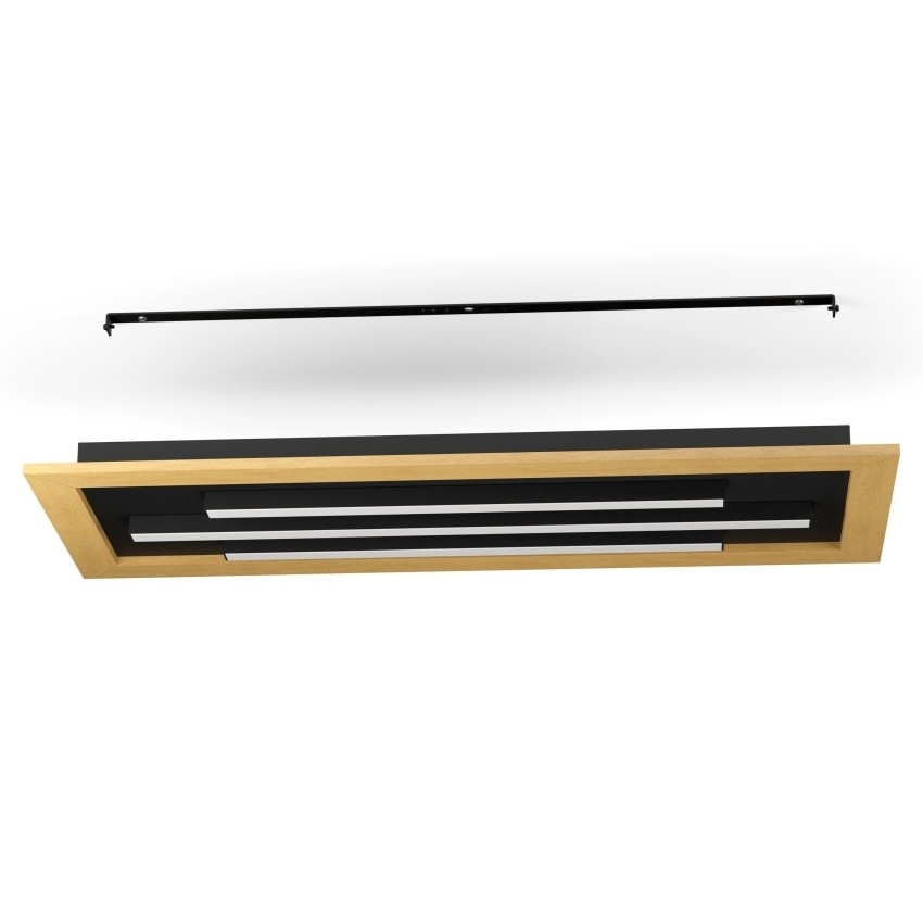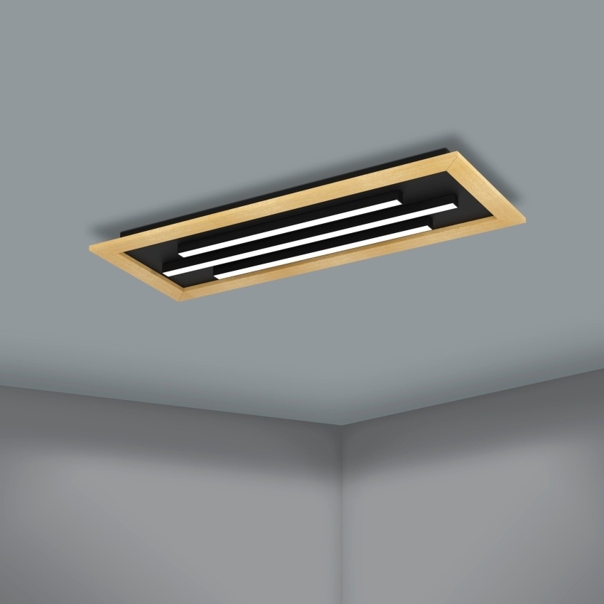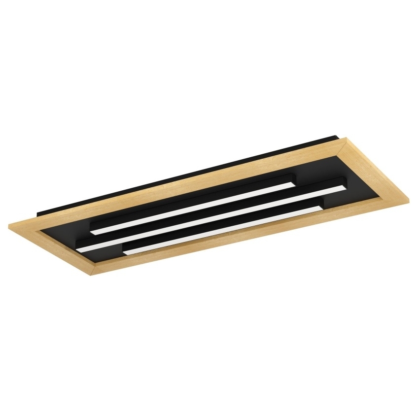 Stropní svítidlo EGLO TIRRENARA 900604 je moderní LED svítidlo v obdélníkovém provedení, které kombinuje černý kovový rám s přírodní dřevěnou dýhou z kaučukovníku. Tři paralelně posunuté LED profily s bílými plastovými difuzory poskytují rovnoměrné a příjemné osvětlení. Pomocí přiloženého dálkového ovladače můžete volit mezi teplým, neutrálním a studeným bílým světlem (2700–6500 K), stmívat intenzitu, aktivovat noční režim nebo časovač s automatickým vypnutím po 30 minutách. Svítidlo se hodí do moderních i přírodně laděných interiérů a je ideální pro obývací pokoje, jídelny, kuchyně či ložnice.