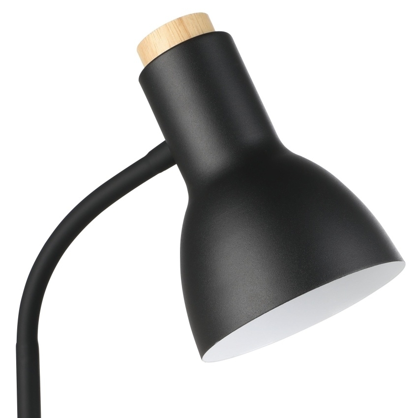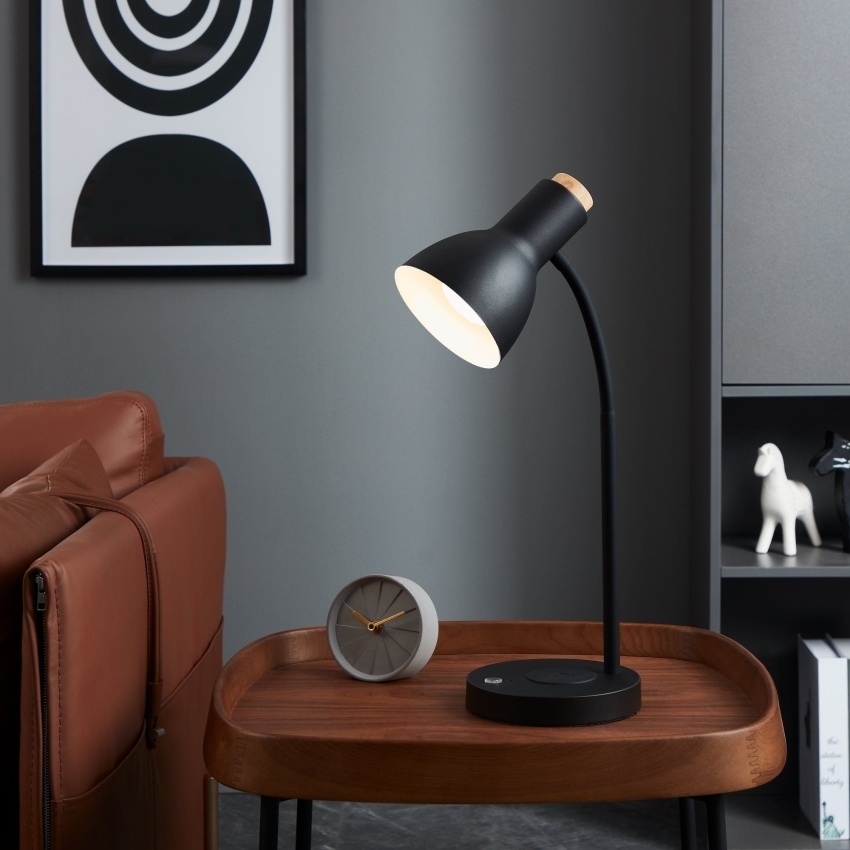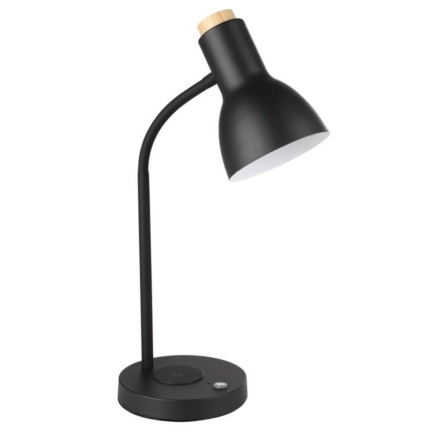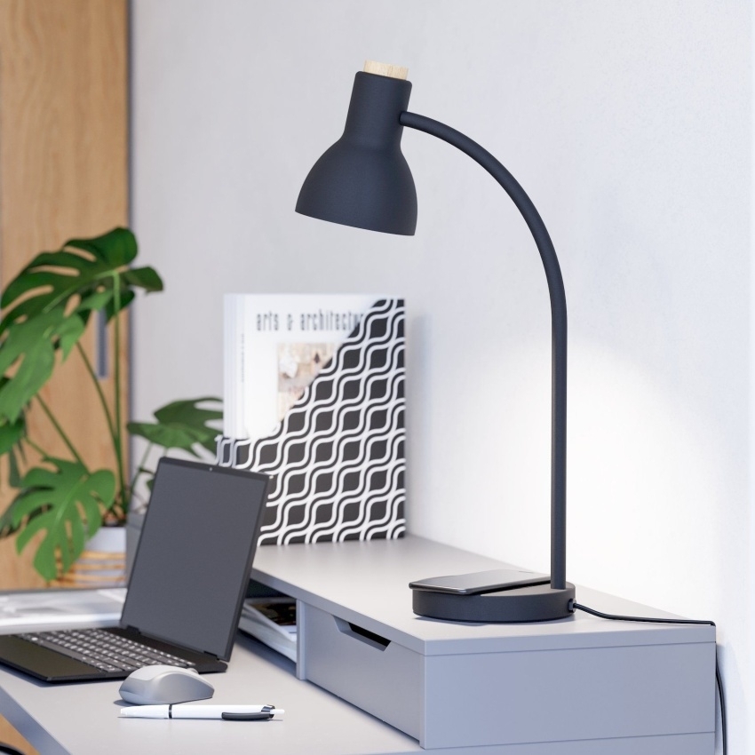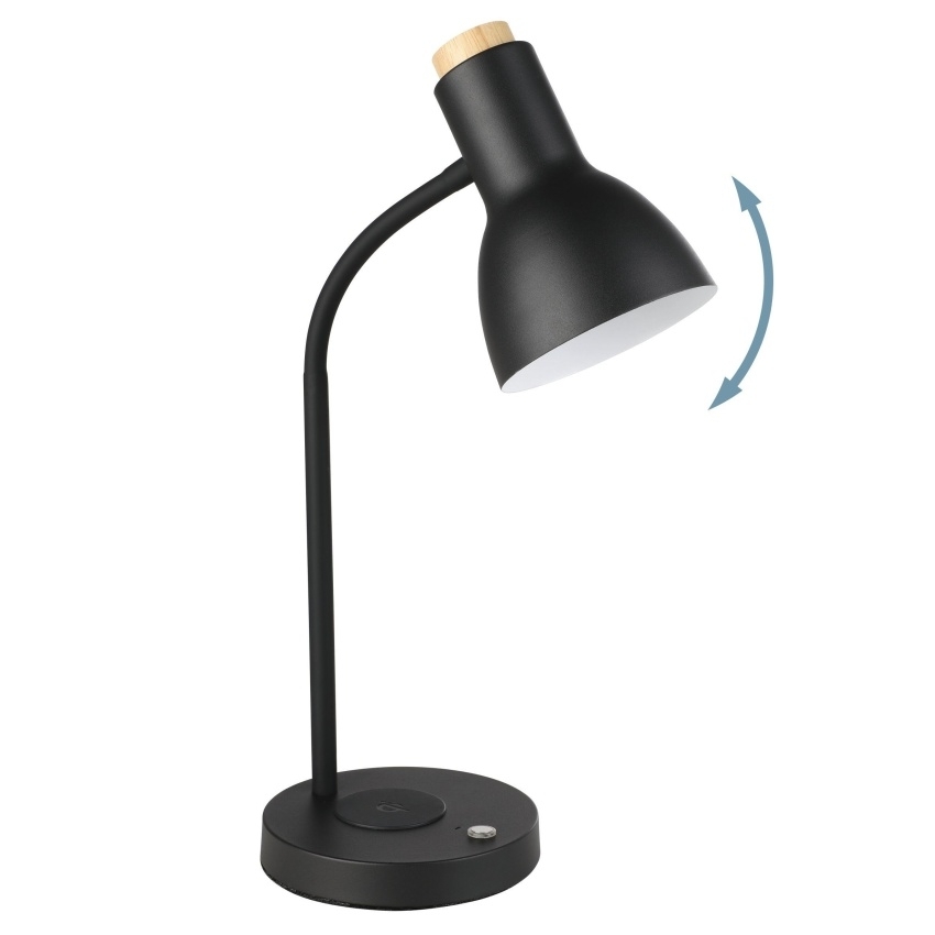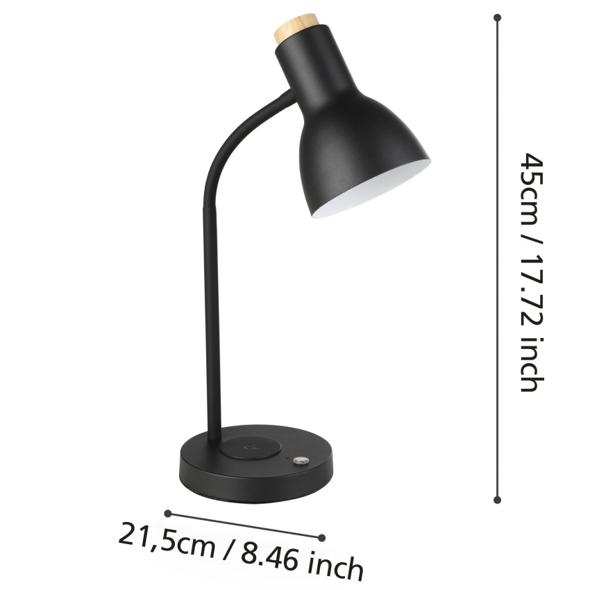 Stolní LED svítidlo EGLO VERADAL-QI 900628 v černo-hnědé kombinaci s FSC dřevem, výkon 5,5 W, 720 lm, teplé bílé světlo, funkce bezdrátového nabíjení.