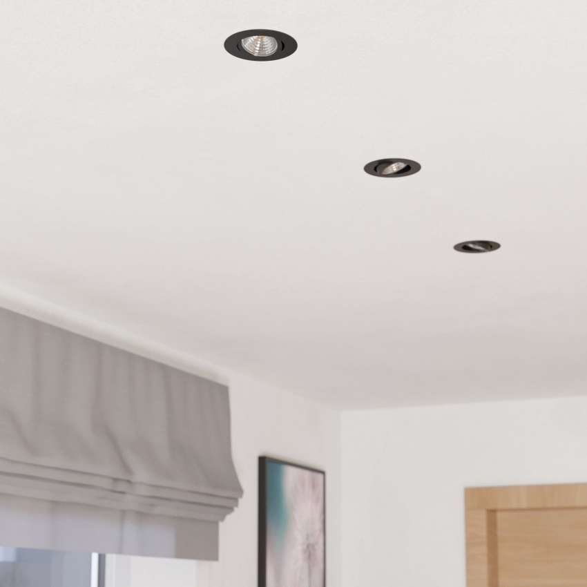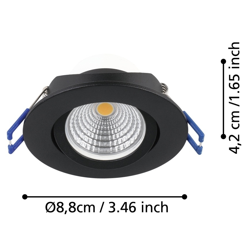 Stylová sada tří vestavných LED svítidel EGLO SALICETO přináší moderní vzhled a efektivní osvětlení pro interiér. Každé svítidlo má minimalistický kruhový design v elegantní černé barvě, který se hodí do moderních prostor i kontrastních stropů. Integrované LED diody s teplým bílým světlem 2700 K poskytují příjemné a útulné osvětlení vhodné pro obývací pokoje, ložnice či chodby. Svítidla jsou stmívatelná, což umožňuje přizpůsobit jas podle aktuální potřeby. Díky kompaktním rozměrům s průměrem 88 mm a vestavnou hloubkou 88 mm se snadno instalují do podhledů i sádrokartonových stropů. Kvalitní hliníkové tělo zajišťuje dlouhou životnost a moderní vzhled.