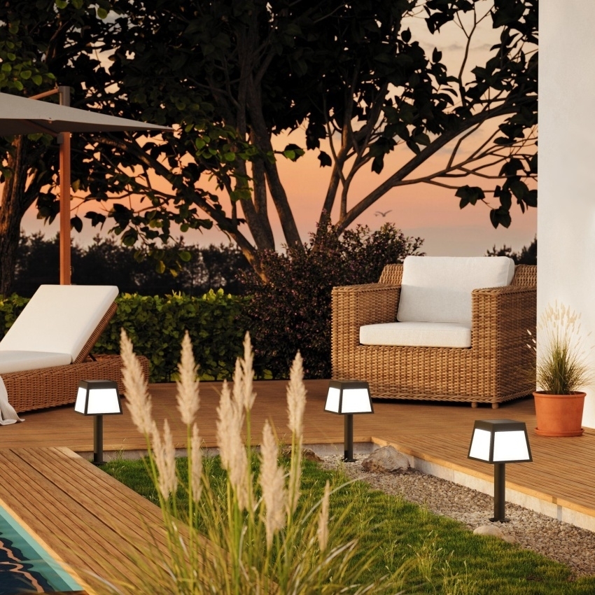 Solární zapichovací svítidlo EGLO ALTILIA 901074 je elegantním a ekologickým řešením pro venkovní osvětlení. Díky integrovanému solárnímu panelu se svítidlo přes den nabíjí a po setmění automaticky rozsvítí teplé bílé světlo o teplotě 3000 K. Černé plastové tělo s bílým stínidlem působí moderně a snadno zapadne do jakéhokoli exteriéru. Zapichovací konstrukce umožňuje rychlou instalaci bez nutnosti kabeláže. Ideální pro osvětlení zahradních cest, květinových záhonů, teras nebo vstupních prostor.