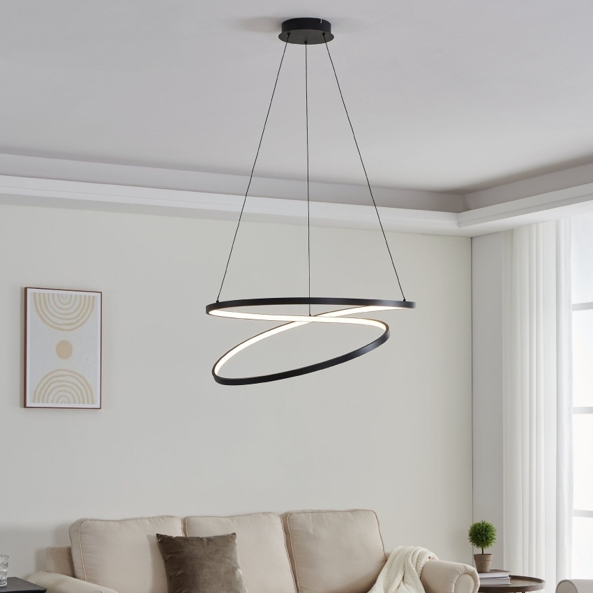 Moderní závěsné svítidlo EGLO RUOTALE 901138 zaujme svým elegantním kruhovým designem o průměru 700 mm, který se skvěle hodí do prostorných interiérů. Vyrobené z kombinace černého hliníku, oceli a bílého plastového difuzoru, poskytuje rovnoměrné teplé bílé světlo s výkonem 42 W a světelným tokem 5000 lm. Díky svému minimalistickému vzhledu a vysoké svítivosti je ideální pro osvětlení jídelního stolu, obývacího pokoje nebo moderní kanceláře. Kvalitní zpracování a elegantní povrchová úprava zaručují dlouhou životnost a estetický vzhled.