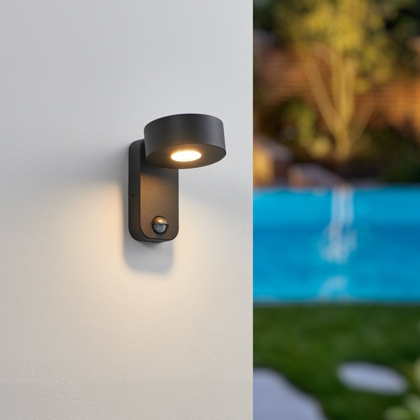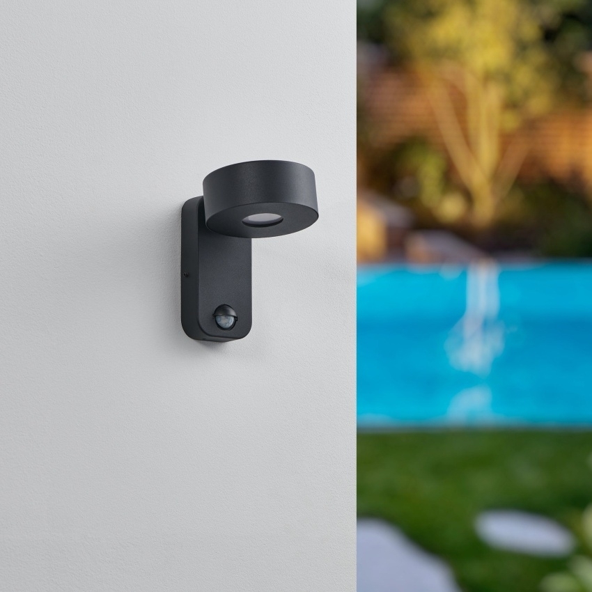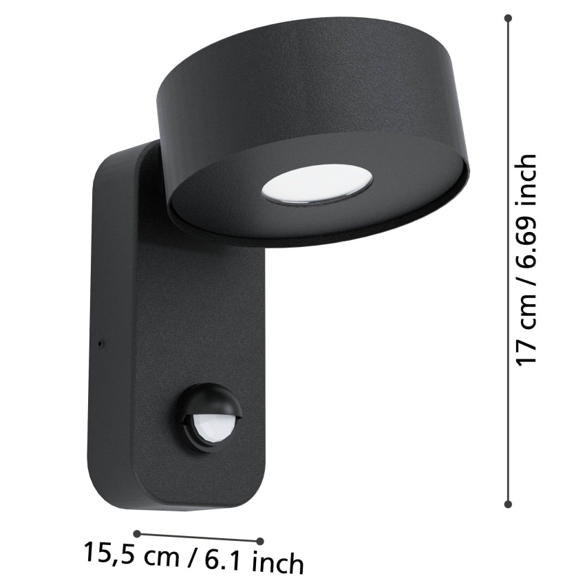Venkovní nástěnné LED svítidlo EGLO PALOSCO 98738, 4,9 W, 360 lm, 3000 K (teplá bílá), se senzorem, černá, IP44.