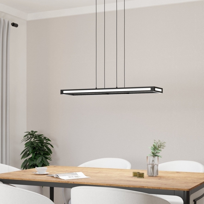 EGLO SALVILANAS-Z 99678 je inteligentní závěsné LED svítidlo z chytré řady EGLO Connect-Z Smart Home, které kombinuje moderní design s chytrým ovládáním. Obdélníkový rám z černého kovu doplněný o bílé difuzory vyzařuje světlo jak směrem dolů, tak i nepřímo po svém obvodu, čímž vytváří příjemnou světelnou atmosféru. Pomocí aplikace AwoX Home Control nebo dálkového ovladače lze snadno měnit teplotu bílé barvy v rozsahu 2700–6500 K, stmívat či zapínat a vypínat svítidlo. Podpora Bluetooth a ZigBee 3.0 umožňuje propojení se systémem chytré domácnosti i hlasovými asistenty. Díky délce 77 cm je ideální pro umístění nad jídelní nebo pracovní stůl.