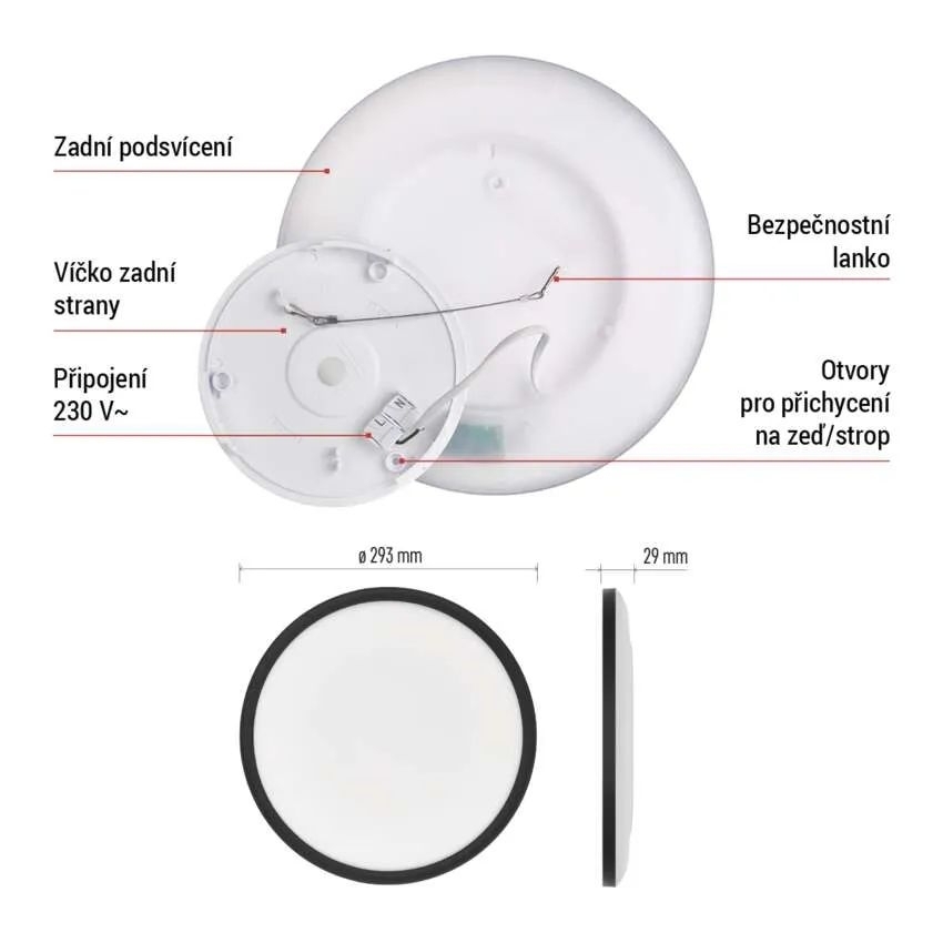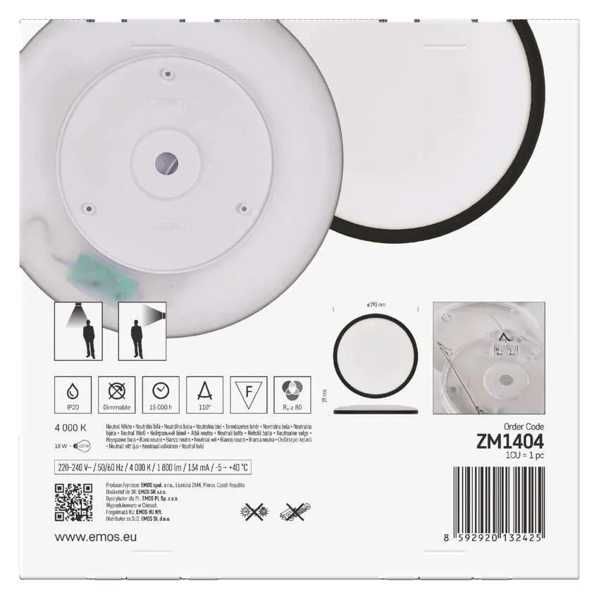 LED přisazené svítidlo EMOS FLORI v moderním kruhovém provedení a černé barvě je skvělou volbou pro designové a úsporné osvětlení interiéru. S příkonem 18 W a světelným tokem 1800 lm efektivně nahrazuje klasickou 115W žárovku. Neutrální bílé světlo o teplotě 4000 K vytváří příjemnou atmosféru vhodnou pro kuchyně, chodby, obývací pokoje, ložnice a další obytné prostory. Funkce backlight navíc umožňuje jemné prosvícení směrem ke stropu, čímž zajišťuje dekorativní světelný efekt. Svítidlo se snadno instaluje díky praktické montážní konzoli a svým nadčasovým designem doplní každý moderní interiér.