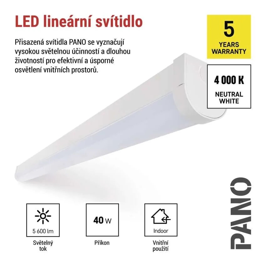 LED lineární svítidlo EMOS PANO ZAB102 má světelný tok 5 600 lm, teplotu chromatičnosti 4 000 K a barvu světla neutrální bílá. Krytí je IP20, index podání barev Ra >80, úhel vyzařování 120° a stupeň ochrany proti mechanickým nárazům IK06. Příkon je 20-25-35-40 W, napětí 220-240 V, frekvence 50/60 Hz a proud 180 mA. Materiál je plast/kov, materiál difuzoru plast (PC), materiál těla ocelový plech a barva těla bílá. Svítidlo umožňuje průběžnou montáž a typ montáže je přisazená, závěsná, na zeď. Rozměry jsou 1 200 × 65 × 66 mm a životnost 50 000 hodin. Podle uvedeného popisu je ideální do kanceláří, komerčních prostor i domácího prostředí.