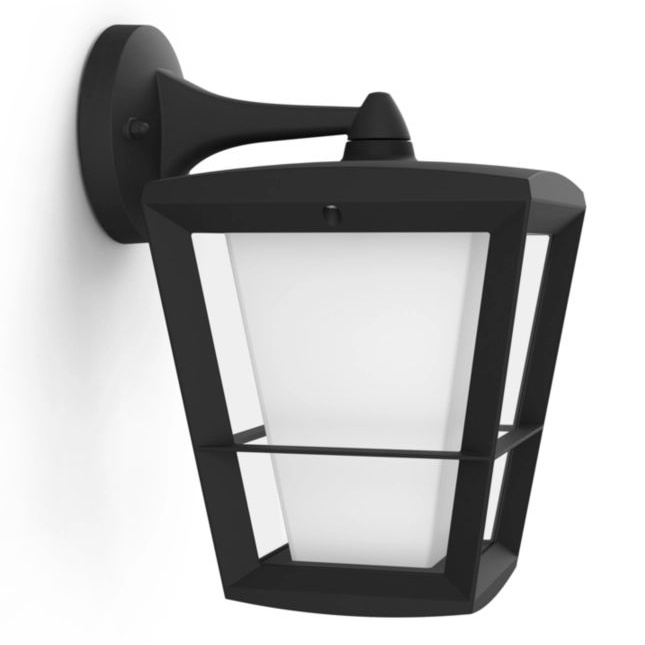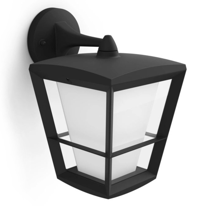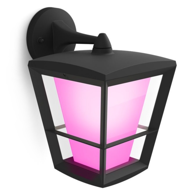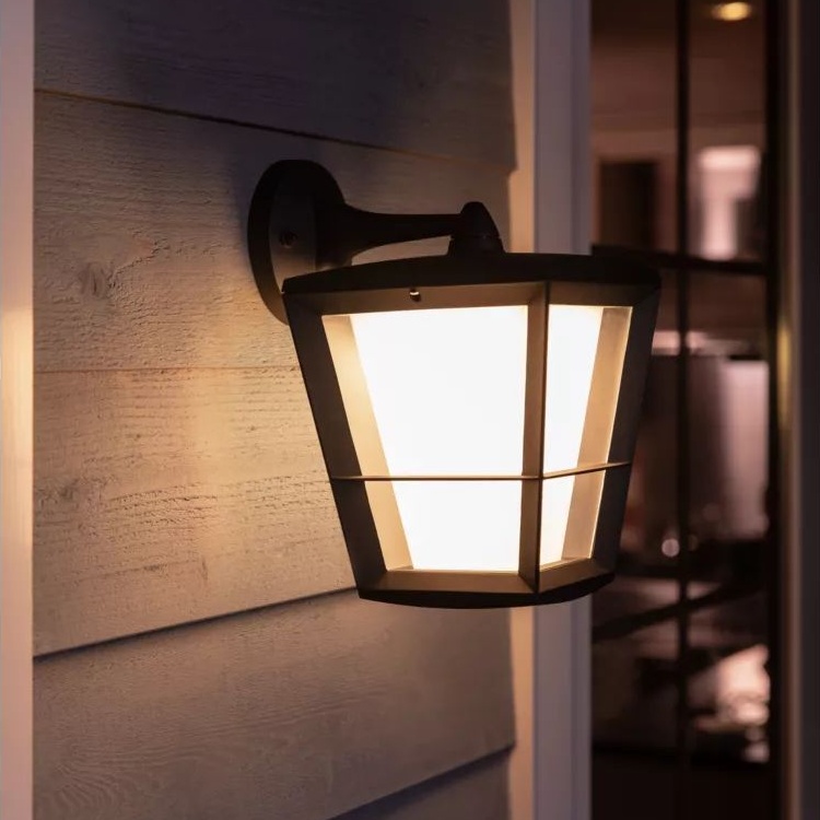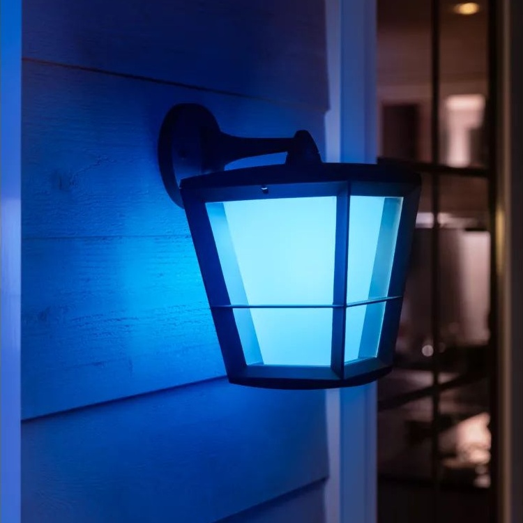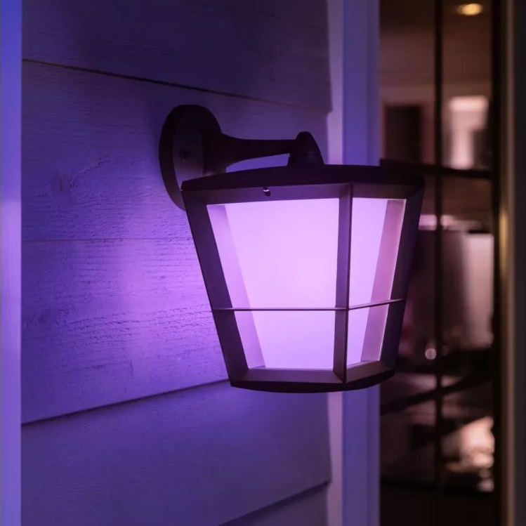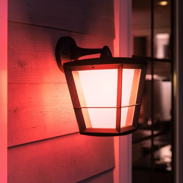 Venkovní hranatá nástěnná lucerna Philips Hue Econic s vrchním uchycením v módním designu klasického tvaru pro chytré rozsvícení venkovních prostor v okolí vstupu do domu nebo terasy.