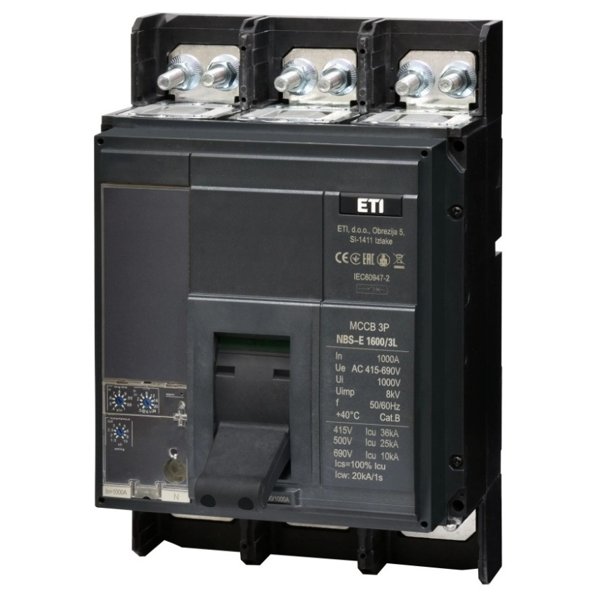 Kompaktní jistič ETI NBS-E 1600/3L s jmenovitým proudem 1000 A, třípólové provedení, kód 004673161.