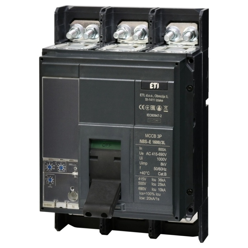 Kompaktní jistič ETI NBS-E 1600/3L s jmenovitým proudem 800 A, třípólové provedení, kód 004673160.