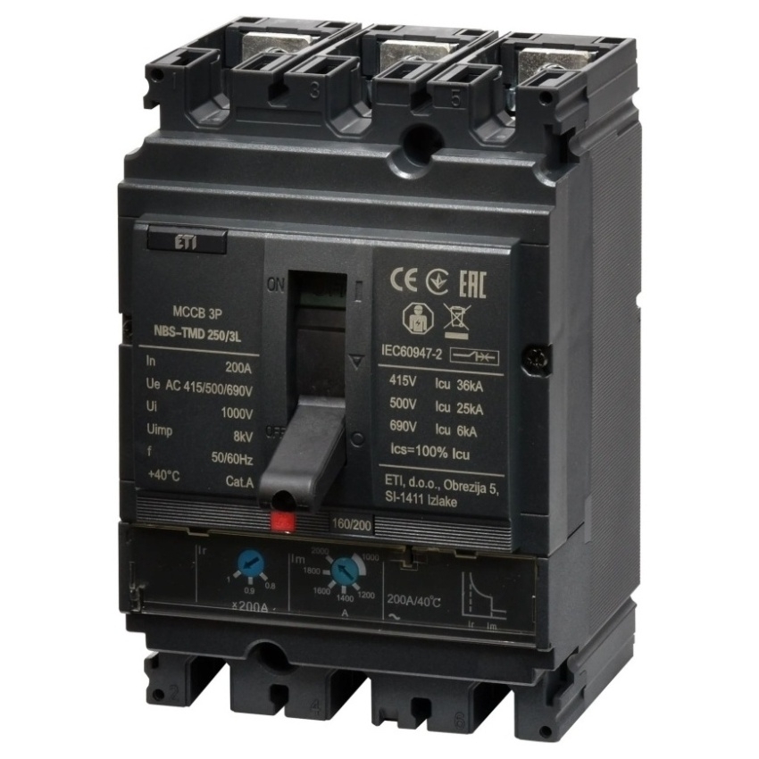 Kompaktní jistič ETI NBS-TMD 250/3L s jmenovitým proudem 200 A, třípólové provedení, kód 004673071.