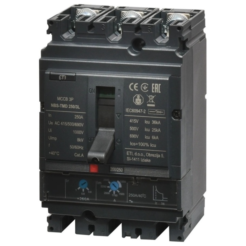 Kompaktní jistič ETI NBS-TMD 250/3L s jmenovitým proudem 250 A, třípólové provedení, kód 004673072.