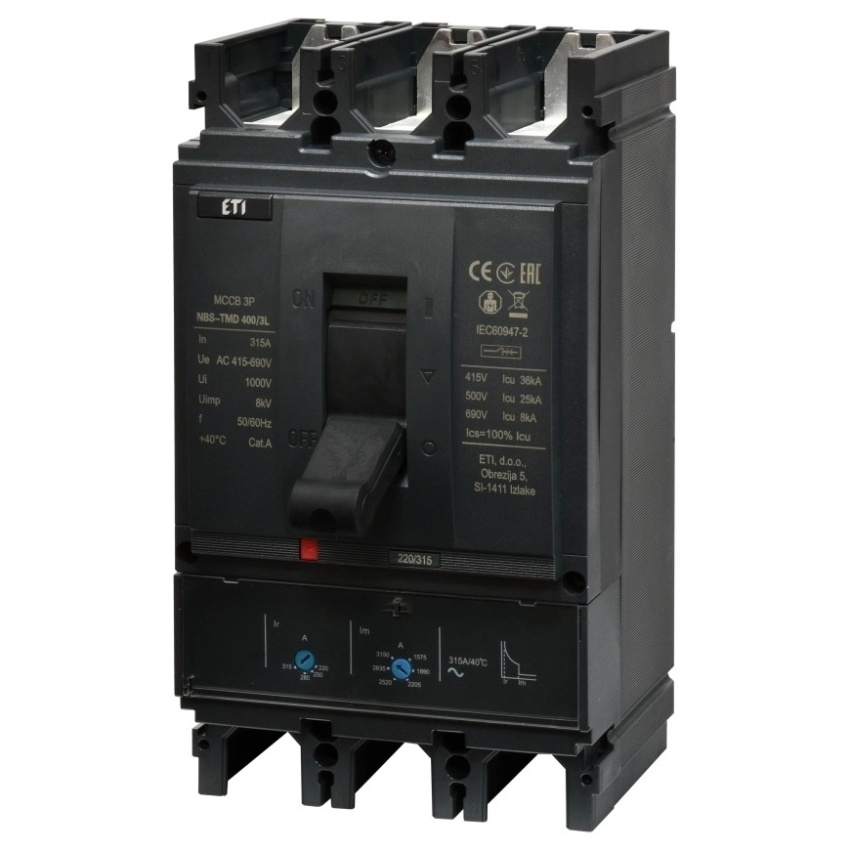 Kompaktní jistič ETI NBS-TMD 400/3L s jmenovitým proudem 315 A, třípólové provedení, kód 004673101.
