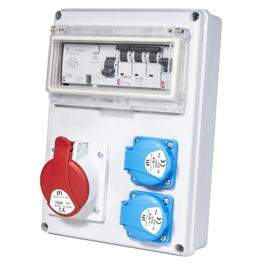 Kombinace zásuvek ETI EDS8 RCD 2/1 16 B+C s jmenovitým proudem 32 A a krytím IP44. Obsahuje zásuvky 1× 16A (5P) a 2× GROUND PIN. Osazena je jističi 1× B16/1 a 1× C16/3 a doplněna o RCD.
