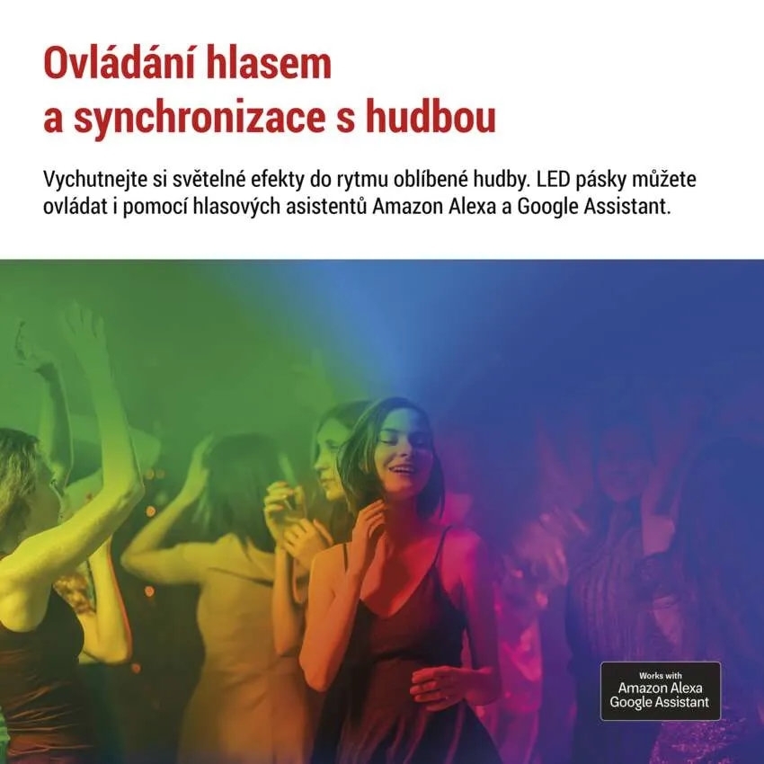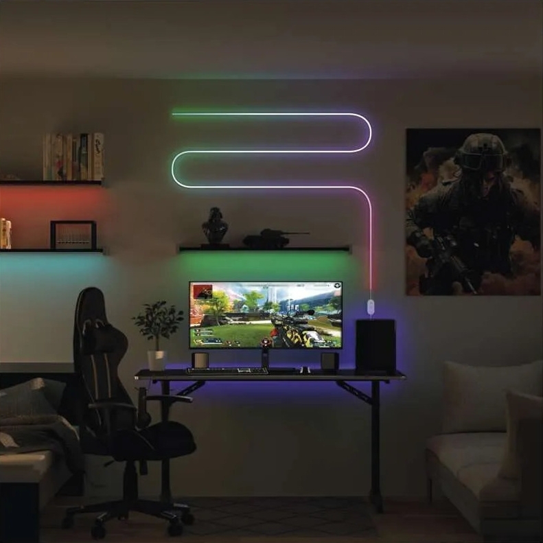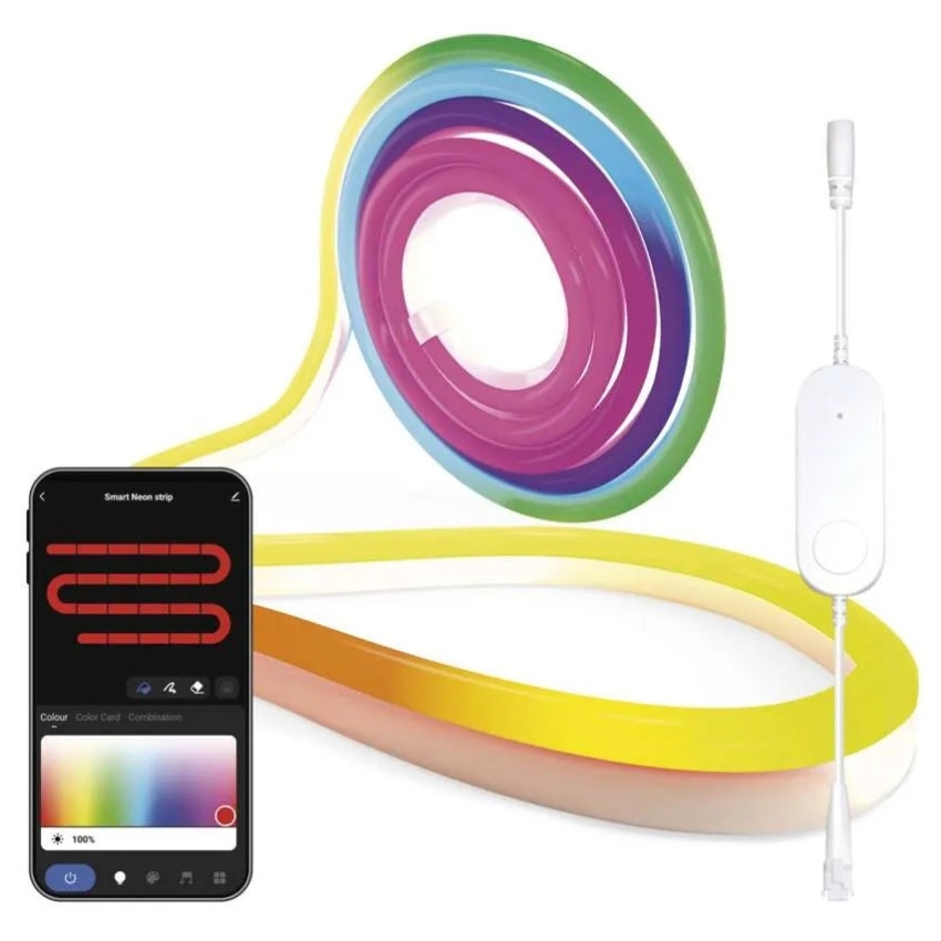 Ohebný LED pásek NEON má délku 5 000 mm a příkon 33 W a je osazen LED technologií s barevným provedením RGBIC. Pásek je stmívatelný, umožňuje nastavení barev RGB a je ovladatelný prostřednictvím mobilní aplikace na operačních systémech iOS a Android pomocí protokolů Wi-Fi a BLE. Tělo i difuzor jsou vyrobeny ze silikonu v bílé barvě, stupeň krytí je IP20 a napájení je řešeno napětím 200–240 V~/50 Hz.