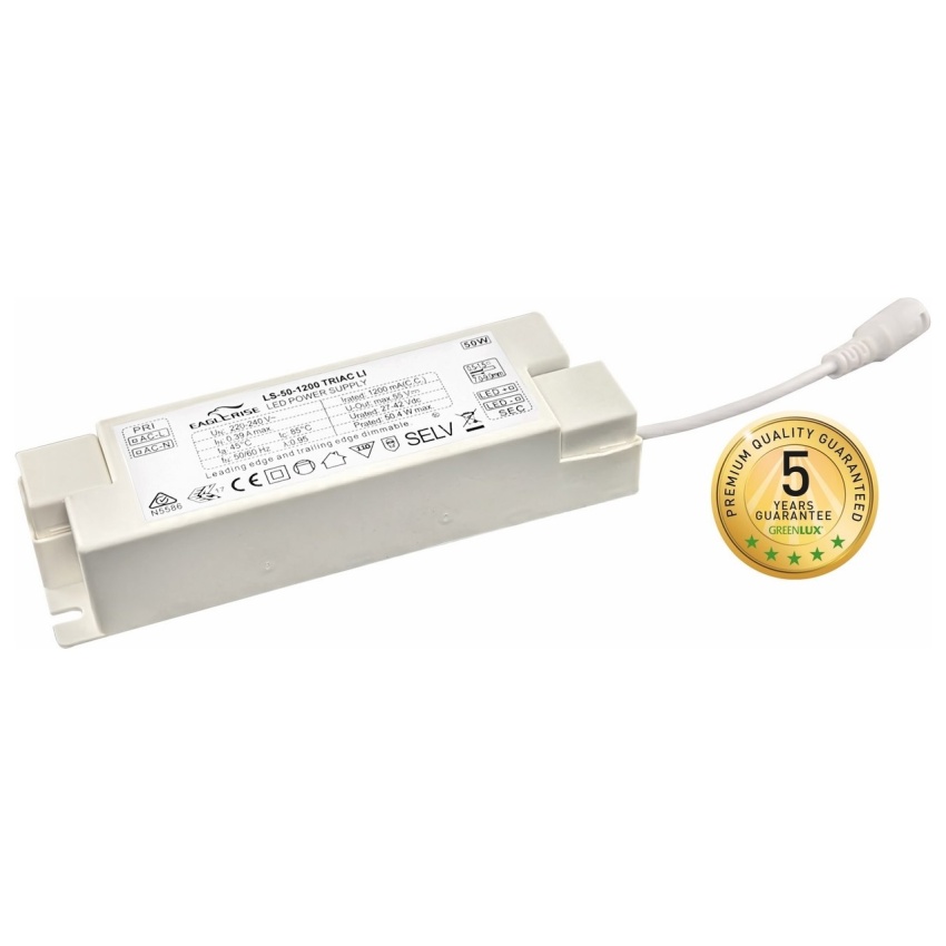 LED DRIVER TRIAC EAGLERISE Regulovatelný LED driver s bezpečným SELV napětím a konstantním proudem 1200mA. Určen k regulaci intenzity osvětlení LED svítidel napájených externím driverem, který nahradí. Regulace probíhá přes fázový vodič na náběžné hraně (leading edge LE) nebo sestupné hraně (trailing edge TE). Kompatibilní s LED svítidly řady VEGA, LINX, VIRGO (tabulka kompatibility ke stažení v souvisejících dokumentech) Možnost použití i u jiných svítidel s totožnými napěťovými a proudovými parametry. Díky kvalitním komponentům dosahuje energetické účinnosti více než 87%. Umožňuje stmívání v rozsahu 10-100%. K ovládání je možné použít stmívač GXKP095 nebo obdobný R, L, C stmívač pro TRIAC LED drivery. Technologie flicker-free zamezuje nežádoucímu mihotání světla. Disponuje ochranou proti zkratu, přetížení a přepětí.