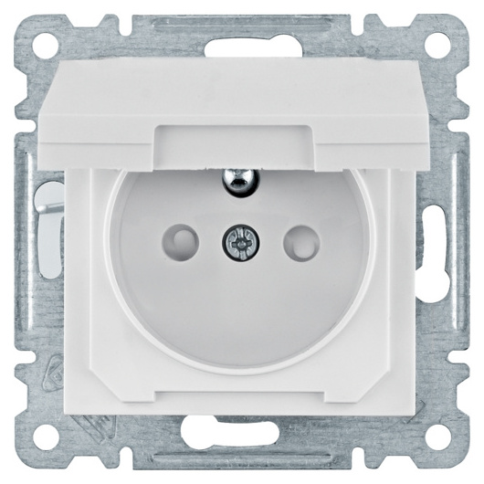Zásuvka Hager Lumina WL1540 se zemnícím kolíkem, s clonkami a víčkem, bezšroubová, IP44, bílá lesk.