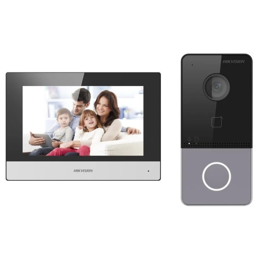 Tato sada je složena z videotelefonu DS-KH6320-WTE1 v černo-stříbrném provedení a dveřní stanice DS-KV6113-WPE1(C). Videotelefon je vybaven 7" displejem s rozlišením 1024×600 px, který poskytuje jasný a detailní obraz. Dveřní stanice obsahuje 2Mpx kamerový modul s horizontálním úhlem záběru 131° a jedním výstupním kontaktem, přičemž pro napájení elektrického zámku je nutné použít externí zdroj. Celý systém je kompatibilní s mobilní aplikací HIK-CONNECT, která umožňuje vzdálené přijímání a sdílení videohovorů na smartphonu nebo tabletu. Součástí balení jsou také napájecí zdroje, což usnadňuje instalaci a provoz. Díky kompaktním rozměrům obou jednotek se sada hodí i do moderních interiérů a exteriérů.
