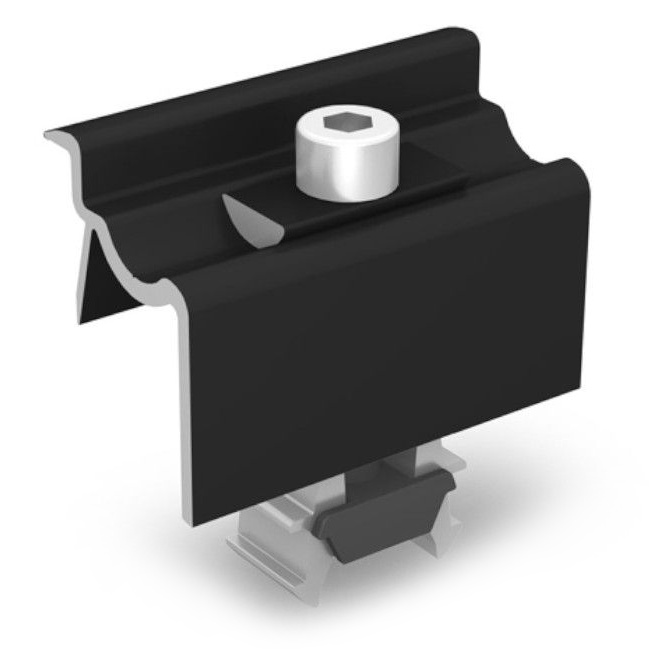 K2 One End je krajní úchyt černě eloxovaný s jednoduchou funkcí click pro pevné uchycení solárních panelů v rozmezí 30-42mm. Vyrobený z eloxovaného hliníku EN AW 6063 T66, EN AW 6082 T6, nerezová ocel 1.4301, zajišťuje stabilitu, dlouhou životnost a je vhodný pro instalace na ploché i šikmé střechy