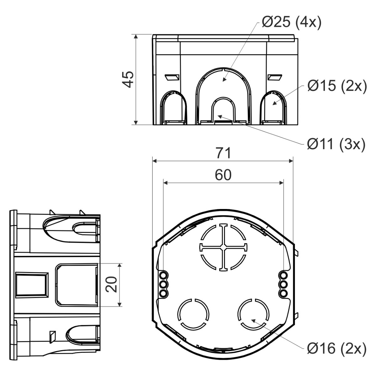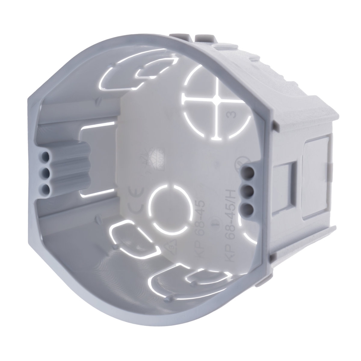 KP 68-45 - KRABICE PŘÍSTROJOVÁ, konfigurace KA, barva šedá, balení po 100 ks v kartonu - možnost spojení v souvislou řadu s roztečí 71 mm, krabice lze spojovat s krabicemi KP 68-30, KPR 68-70, KP 68/D, KPR 68/D, KU 68-45, možnost vložení bezšroubových svorek