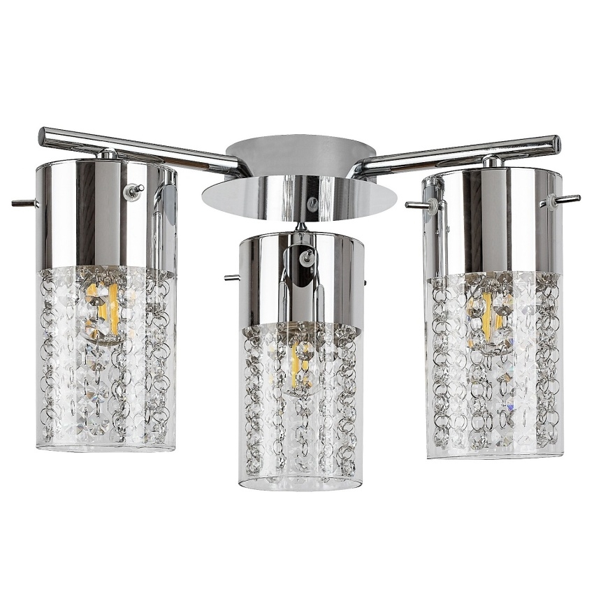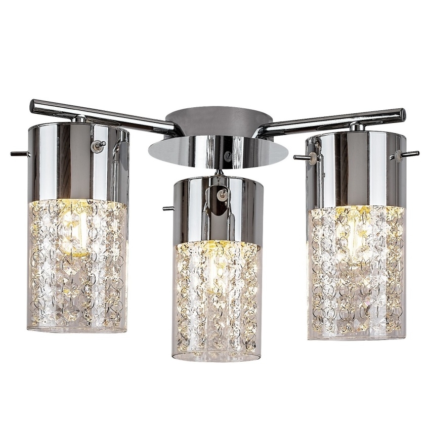 Koupelnové stropní svítidlo Rabalux Niagara 2195 v klasickém stylu zaujme elegantní kombinací chromového kovového těla a průhledných skleněných stínidel. Tři světelné body zavěšené na kovových tyčích vytvářejí efektní a zároveň vyvážené osvětlení celé koupelny. Každé stínítko je doplněno dekorativními křišťálovými prvky, které svítidlu dodávají luxusní vzhled a připomínají proudící vodu. Díky krytí IP44 je svítidlo chráněno proti stříkající vodě, a proto je vhodné pro bezpečné použití v koupelně. Model je určen pro tři žárovky s paticí E14 a maximálním výkonem 40 W. Dodává se bez světelných zdrojů.