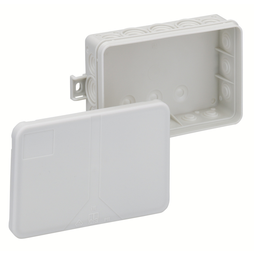 Spojovací krabice podle DIN EN 60670 (VDE 0606), 16 přívodů, 3 spodní přívody, kompletní s děrovacím nástrojem a zaslepovací zátkou, s vnějšími místy připojení, krytí IP55, do 2,52, s pevností IK07, třída ochrany II, VDE zkouška, bez halogenů, 130 x 85 x 37 mm, šedá, bez svorek, pro samostatné svorky s certif. VDE.