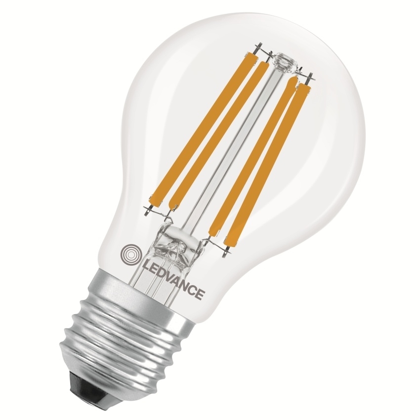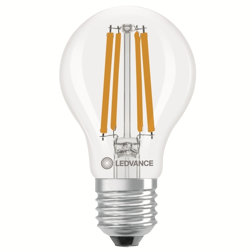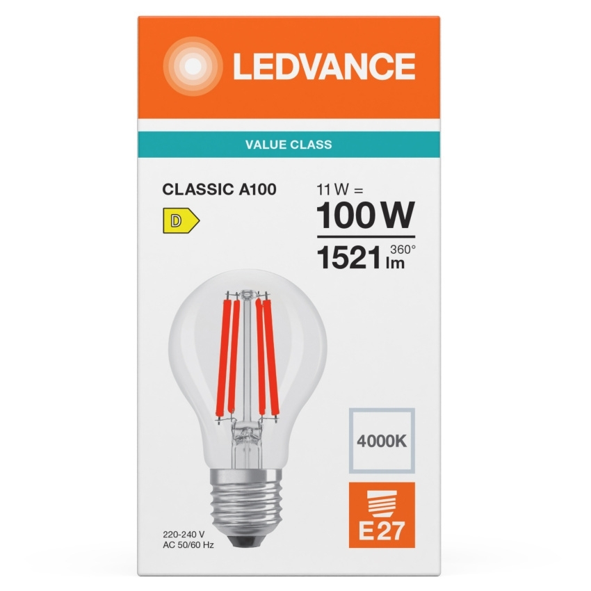 LED žárovka LEDVANCE LED Classic A 100 Filament V 11W 840 Clear E27 je LED alternativou ke klasickým žárovkám v tradičním tvaru. Při příkonu 11 W poskytuje světelný tok 1521 lm, barvu světla 840 a teplotu chromatičnosti 4000 K. Čiré provedení, vyzařovací úhel 300° a patice E27 umožňují snadnou náhradu běžných světelných zdrojů. Světelný zdroj je nestmívatelný a dosahuje životnosti až 10000 hodin. Je ideální do domácností a pro všeobecné osvětlení, ve venkovním prostředí pouze ve vhodných venkovních svítidlech.