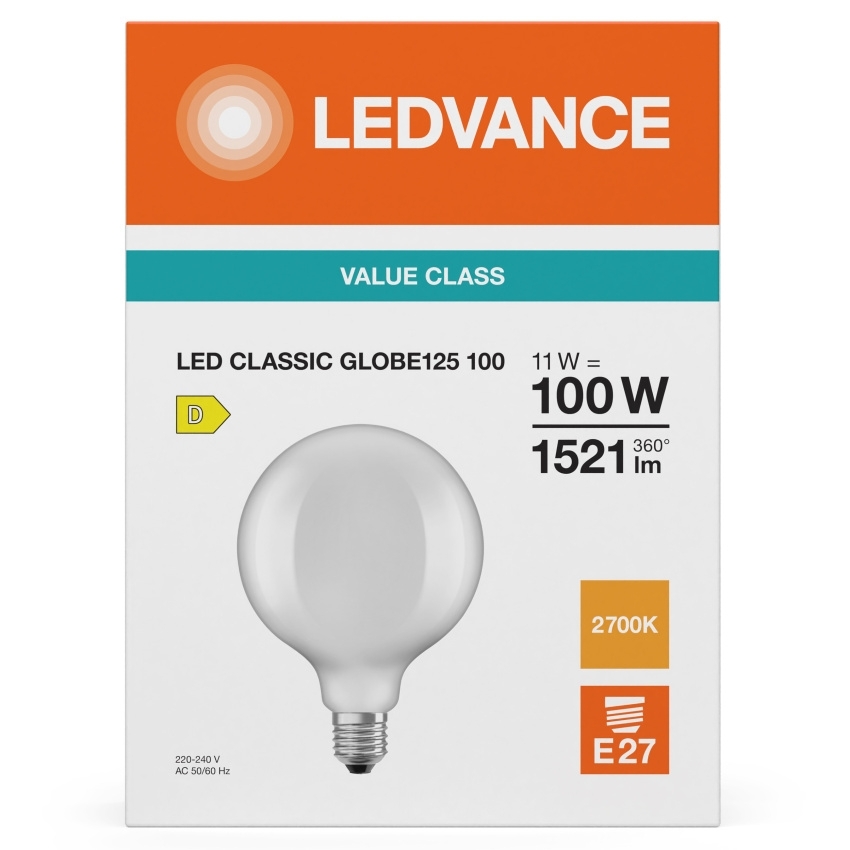 LED žárovka LEDVANCE LED Classic Globe 125 100 Filament V 11W 827 Frosted E27 nabízí příkon 11 W, světelný tok 1521 lm a teplé bílé světlo 2700 K v matném kulatém provedení s paticí E27.