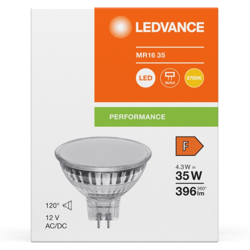 LEDVANCE LED MR16 35 120° je úsporná náhrada za nízkonapěťové halogenové žárovky s paticí GU5.3. Nabízí teplé bílé světlo (2700 K), okamžitý plný výkon a nízkou spotřebu 4,3 W. Díky širokému vyzařovacímu úhlu 120° je ideální pro rovnoměrné osvětlení interiérů. S životností až 15 000 hodin a skleněným tělem je vhodná pro použití v domácnostech i komerčních prostorách bez potřeby přepojování.
