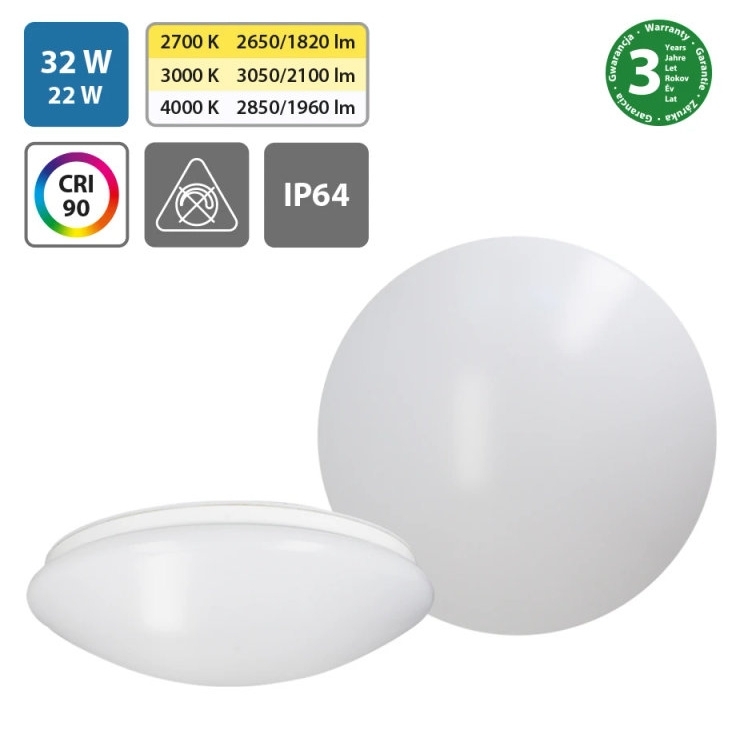 Přisazené LED stropní a nástěnné svítidlo s možností přepínání výkonu a teploty chromatičnosti.
