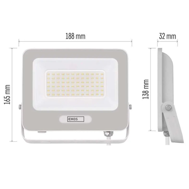EMOS ZS2244W je LED reflektor řady GLARO s příkonem 50 W a světelným tokem 5000 lm. Teplota chromatičnosti je 4000 K (neutrální bílá), index podání barev Ra > 80, světelná účinnost 100 lm/W a vyzařovací úhel 120°. Napájení 220–240 V~ / 50–60 Hz, proud 215 mA, účiník > 0,9. Krytí IP65, materiál těla hliník, difuzor sklo, délka přívodního kabelu 20 cm (H05RN-F), rozměry 188 × 165 × 32 mm, životnost 20 000 hodin.