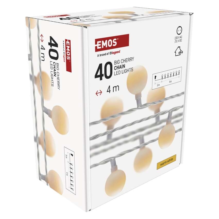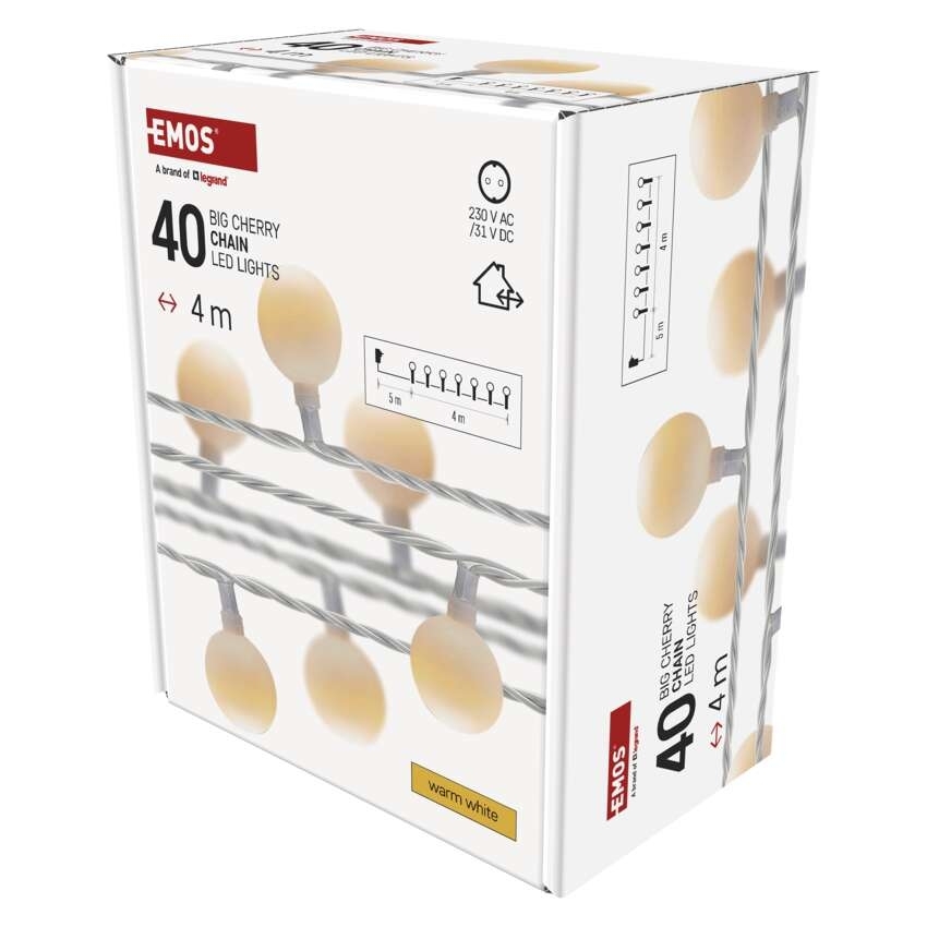 EMOS LED světelný cherry řetěz – kuličky 2,5 cm, 4 m, venkovní i vnitřní, teplá bílá, časovač
