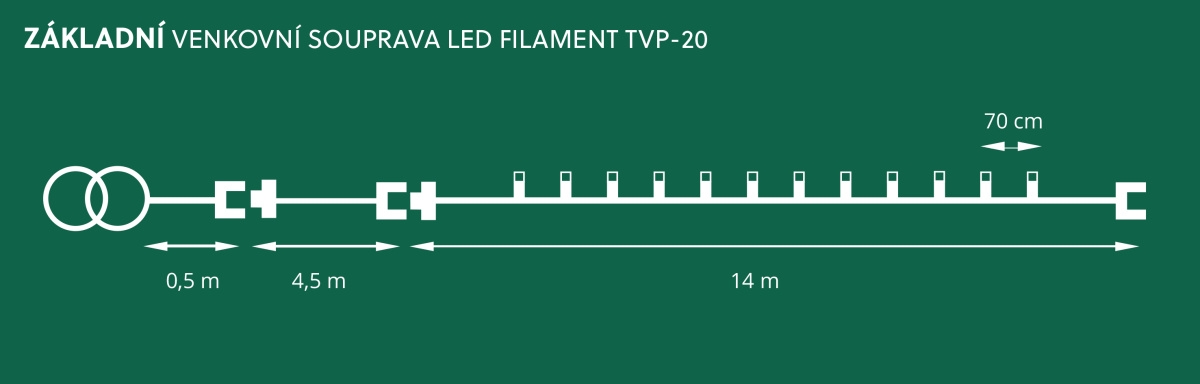 Souprava obsahuje 20 skleněných LED Filament žárovek s příkonem 0,2 W, doplněných o 2 náhradní kusy. Celkový příkon řetězu činí pouhé 4 W, což zajišťuje úsporný provoz. LED zdroje jsou zapojeny paralelně, takže při poruše nebo vyšroubování jedné žárovky ostatní zůstávají v provozu. Součástí je bezpečný napájecí transformátor 230/20 V, 20 VA s přívodním kabelem o délce 5 m a celkovou délkou soupravy 19 m.