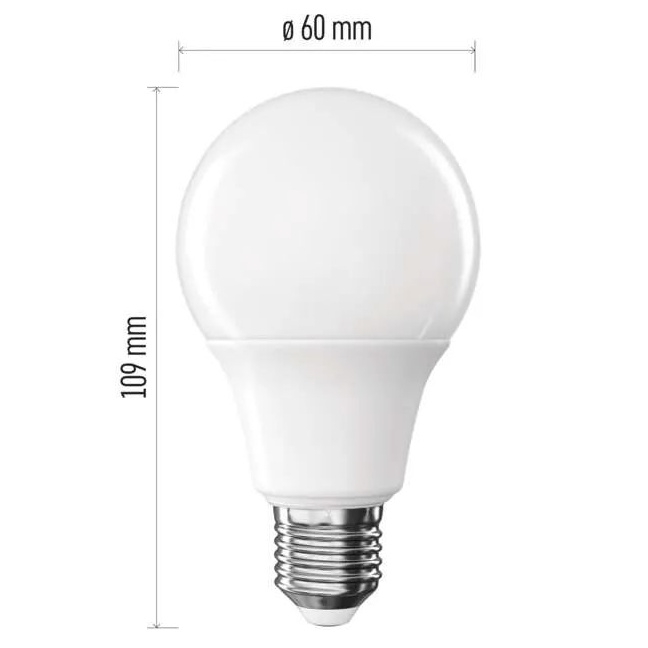 LED žárovka EMOS ZQ5E54 s paticí E27 má příkon 9,5 W a světelný tok 1055 lm. Barva světla je studená bílá s teplotou chromatičnosti 6500 K. Žárovka využívá LED technologii, není stmívatelná a má tvar A60. Světelná účinnost činí 111 lm/W a odpovídá náhradě za 75W klasickou žárovku.